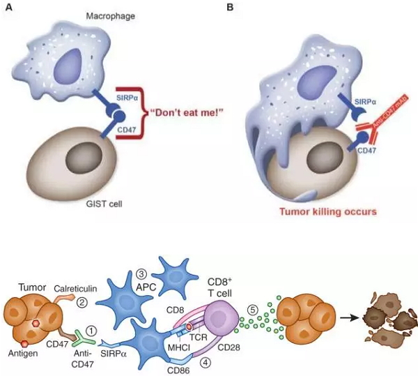 巨噬细胞发挥吞噬效应需要两个信号同时起作用:一个是靶向细胞表面的"eat me"信号的激活,另一个是同意目标表面"don't eat me"信号的失活。任何一个信号的缺少都不足以引发吞噬效应的发生。越来越多的证据表明,CD47是一类"don't eat me"信号,它通过与巨噬细胞表面的SIRP-α相互结合抑制巨噬细胞的同能。