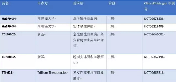 目前处于Ⅰ期临床试验的有三个药物,他们分别为Forty Seven的Hu5F9-G4、Celgene的CC-90002以及Trillium的TTI-621。大约在2016年年底或者2017年这几个公司的Ⅰ期临床将会结束。