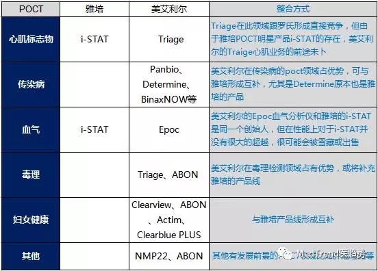 美艾利尔是一个业务非常专注的公司,所有的疾病领域都服务于POCT;而雅培的传统诊断占其业务的80%(包括生化免疫、血液检测和自动化流水线),POCT只占11%。当加入美艾利尔的POCT后,POCT业务很可能将占雅培诊断40%左右的营收。 当然,收购容易整合难,两家公司在多个核心产品上有重要重叠,收购美艾利尔后,雅培可能会采取保留一部分、合并一部分、出售一部分的整合策略。这种产品线的整合将带来种种挑战: ▼雅培、Alere产品线对比 美艾利尔与雅培的重合产品线,为了给雅培的POCT明星产品i-STAT让路,部分业务可能会被雅培出售或雪藏。而美艾利尔的其他业务将补充进雅培的产品线,扩大其业务范围。 最有趣的是,到目前为止,雅培是IVD四巨头里唯一一家还未在中国建设诊断工厂的公司,而中国作为潜力巨大的IVD市场,以及外资企业本土化生产服务是未来的必然趋势。此次雅培通过收购美艾利尔,让其立即拥有了中国本土的诊断试剂工厂和研发基地(2006年Alere收购的杭州艾博),补全了雅培的本土化工厂。