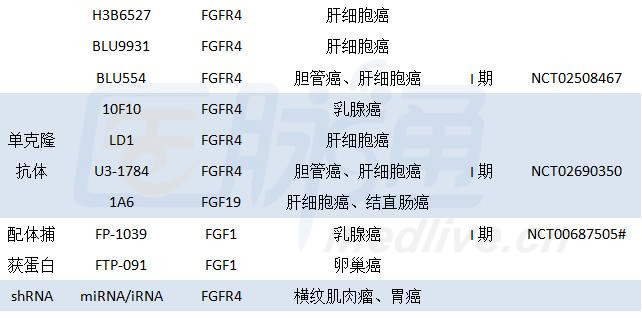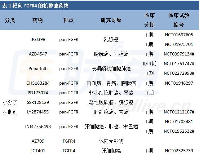 FGFR(fibroblast growth factor receptor)酪氨酸激酶家族包括FGFR1、FGFR2、FGFR3和FGFR4。在生理状态下,FGFR4信号通路被严格控制,而FGFR4信号失调导至癌症的发生发展、增殖、存活及转移。 医脉通参考发表在《肿瘤防治杂志》上的《靶向FGFR4的抗肿瘤药物研究进展》一文,将其中关于FGFR4异常的肿瘤和靶向FGFR4抗肿瘤药物进行整理,详情如下。 FGFR4异常的肿瘤 1.基因突变 FGFR4激酶域激活突变在横纹肌肉瘤、恶性肺腺癌、恶性胶质瘤等肿瘤中均有发现。7%~8%横纹肌肉瘤患者中存在FGFR4激酶活性持续激活的突变,其突变位点主要发生在K535和E550,增加了FGFR4激酶活性,通过STAT3途径活化下游信号通路,但其磷酸化Akt和ERK能力的下降,往往导至具有侵袭性的晚期肿瘤。 然而,肿瘤细胞中FGFR4的突变位点不仅仅发生在激酶域。研究表明,乳腺癌细胞MDA-MB453的FGFR4Y367C突变引起FGFR4自发形成二聚体,从而导至组成型活化ERK,增强MAPK信号通路,促进细胞增殖,诱发肿瘤的形成,且对其配体和抗体的刺激均无反应。 此外,含FGFR4等位基因Arg388或纯合子的肿瘤细胞通过使FGFR4受体内化,导至FGFR4异常信号持续激活,增加乳腺癌的侵袭,降低鳞状细胞癌、肺癌患者存活率,增加前列腺癌恶性程度,增加黑色素瘤的厚度。 2.过表达 39%的食管鳞状细胞癌患者和82%的恶性外周神经鞘膜瘤患者存在FGFR4异常过表达,伴随着不良预后和短的生存期。在乳腺癌患者中大约有32%FGFR4的mRNA表达水平上升,其中有10%是由于FGFR4基因扩增所导至的过表达,且与雌激素受体和孕激素受体水平及淋巴结转移正相关。而在星形胶质细胞瘤中,FGFR4过表达预示着癌症晚期和短的生存期。与良性前列腺增生相比,前列腺癌患者FGFR4的表达水平显著上升,且其表达水平与格里森评分正相关,并伴随着不良转归。大约三分之一的肝癌患者存在FGFR4异常高表达且预后差。此外,FGFR4过表达的卵巢癌、胃癌、胰腺癌、结肠癌有较高的侵袭性,而抑制FGFR4信号通路能显著降低其侵袭性,表明FGFR4是潜在的治疗靶标。 药物研发进展 通过阻断胞外配体分子与受体的结合或胞内激酶信号的传递,抑制FGFR4所介导的增殖信号,是治疗此类肿瘤的有效手段。其方法包括小分子激酶抑制剂、单克隆抗体、配体捕获蛋白和shRNA等。近年研发的靶向FGFR4的抗肿瘤药物及其适应证见表1。