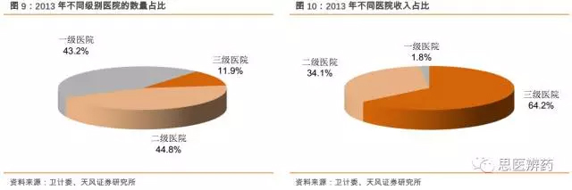 2016年一季度开始,分级诊疗已经有了明确的效果,不同级别的医院数量和门诊量变化是行业的先行指标。2010-2014年,三级医院的数量增长明显快于二级医院,略快于一级医院,这受益于2009年开始的医保扩容,尤其是在2012年,三级医院数量还在疯狂扩张。然而分级诊疗提出后,医院的结构发生了转折变化。2014年借助“PPP”的风潮,民间资本流入医院,导至一二级医院增速超过三级。同时国家开始限制三级医院的持续扩张,三级医院的发展放缓。