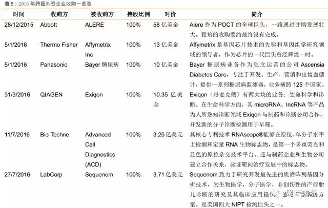 长久以来,国产品牌的主要战场在二级及以下医院,公立三级医院主要还是进口品牌,终端对价格的不敏感,使得部分已经达到临床要求,甚至性能超出进口品牌的优秀国产品牌始终无法抛去“国产的帽子”,没有在市场上公平竞争的机会。而随着国产设备的研发实力不断提升,尤其在登录资本市场后融资能力有了质的飞跃,未来进口替代只是时间的问题。同时,国家的政策保护,将有利于国产品牌的发展壮大,进一步奠定龙头企业的地位。 医保支付能力是医改的核心矛盾,国产器械有效市场空间不断扩容 降价/招标/医保控费,进一步降低医疗器械价格,国产市场扩容。将是未来医改针对的核心矛盾,医疗器械依然处于长期降价趋势。体外诊断按照项目收费,收费端是固定的,因此诊断仪器和耗材成为了成本项。不同省份的收费标准和收费规则有巨大的差异,相同项目的收费在不同省份,最大有5-10倍的差异。诊断产品的毛利极高,与不合理定价有密切关系。未来随着行业的规范化,收费标准下调是必然趋势。 各个省份的采购模式和招标政策都有明显的差异,大致分为如下几种模式: 1.直接挂网阳光采购:如陕西、四川等区域的阳光采购。 2.挂网+联合议价模式:比如西部六省联盟(陕西省、内蒙古自治区、四川省、宁夏回族自治区、青海省、甘肃省)、三明联盟(宁波、珠海、乌海、鄂尔多斯、玉溪、铜仁、太原、三明、厦门、唐山、邯郸、沧州、衡水、邢台、张家口以及河北28个医改示范创建县、庆阳等共41个地级市)、京津冀联盟、华东四省联盟等联盟团体。其耗材采购,集中建立在数据互联互通、资源共享的基础之上,再进一步推动跨区域的价格联动和联合采购,以进一步降低医用耗材虚高价格。 3.药交所模式:通过第三方药品电子交易平台(既独立于医疗机构和医药生产经营企业又独立于政府)集中交易工作。价格进行每季度滚动竞价。 4.三步评审双信封模式:如宁波、浙江、河南、新疆等省。以技术标+商务标的模式进行三步评审。 以上常见模式,其本质是以不同的形式来进行议价。在此之前,浙江地区的招标已经有多年历史,长久都是价格洼地,然而由于浙江的经济发展水平比较高,即使是县级医院也在使用生化免疫流水线,是非常优质的客户群体,因此进口品牌对于个别特殊的区域会给与特殊的价格政策。如果未来降价成为主流,各个省区都有降价的趋势,我们认为进口品牌大幅降价的可能性不高。 价格的下降和收费的下降,对于国产品牌而言都是利好,价格的下降会伴随着量的提升,目前体外诊断行业的进口占比在60-70%之间,收费标准下调,在产品可替代的范围内,国产品牌受益。 产业并购加剧,市场垄断巨头逐渐浮出水面 作为医疗器械中的重要组成部分,体外诊断由于其独有的属性,使得越来越多的企业能够在A股登录,借助资本的力量以更快的速度发展壮大。在上市前,不同企业的竞争优势体现在产品、渠道、推广等等方面。上市后,除了企业自身的发展,企业的并购整合、战略方向的不同使得企业出现了分化,同时融资难度降低,并购则是上市后企业得以发展最主要的工具之一。根据并购的主体和标的不同可以大致分为三类:海外巨头的并购和合并、国内企业海外并购、国内企业国内并购。 海外巨头合并,行业哥斯拉还在成长 纵观海外IVD巨头,经过一轮自由竞争,市场格局趋于稳定。在其细分领域发展到极致后,只靠内生增长发展速度有限,通过产业并购来注入竞争优势已经是习以为常的状态。企业的并购主要分为技术产品的并购和市场份额的并购。技术产品的并购,缩短了企业的研发周期和降低了研发风险,同时结合初创企业的创新优势和成熟企业的产业化能力而快速推出新产品抢占市场。而市场份额的并购主要是以竞争对手为主,通过提升市场份额,拉大和其他竞争对手的距离,使得市场有序化,避免了市场激烈的价格竞争。企业之间的并购由小企业为主要标的的方式转变为跨国巨头之间的合并。2016年大型的上市企业并购持续成为产业的热点,马太效应的加剧,强者恒强的态势在持续发展。