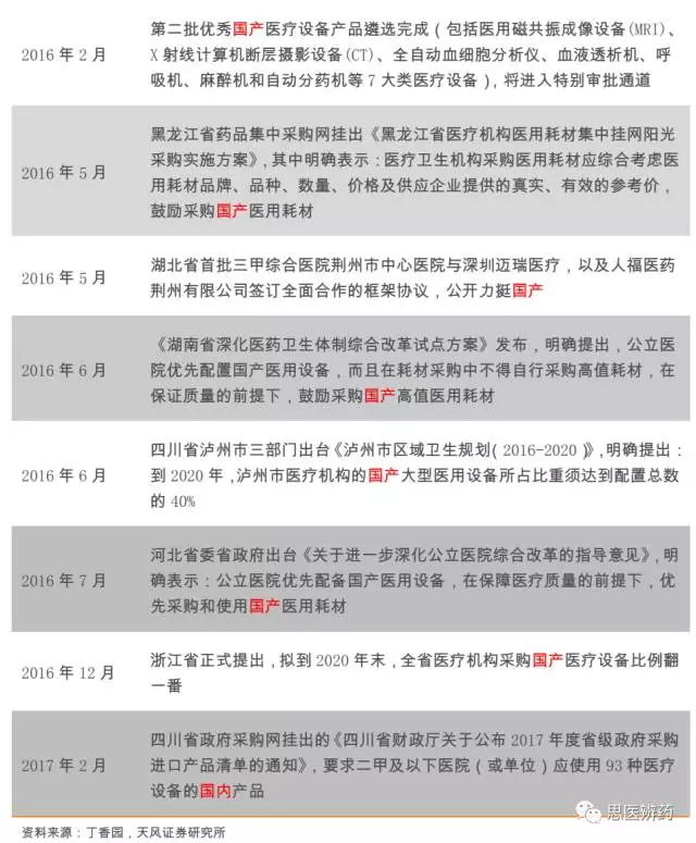 我们认为未来医疗器械注册证,尤其是三类证,会逐渐变得稀缺。尤其是对于临床数据的核查,其检测力度和惩罚强度都远高于任何一个历史时段。在这个过程中,也许会误伤、误杀一些优秀的公司,但是对于行业的玩家,对质量控制、注册流程和法规都提出了更高的要求,是挑战也是机遇。 国产器械受益于国家国产器械进口替代政策,宏观环境良好 尽管如上文所说,注册监管门槛提升,但是对于优质的国产品牌而言却是巨大的机会。多年来,国家对于国产品牌都给予了政策扶持。在某些省份,如四川,要求二级以下医院必须采购国产设备,引起广泛热议。目前国产设备依然还有进步的空间,在一刀切的国产替代操作层面纵然还有一些难度,但是趋势和发展的方向已经一目了然。