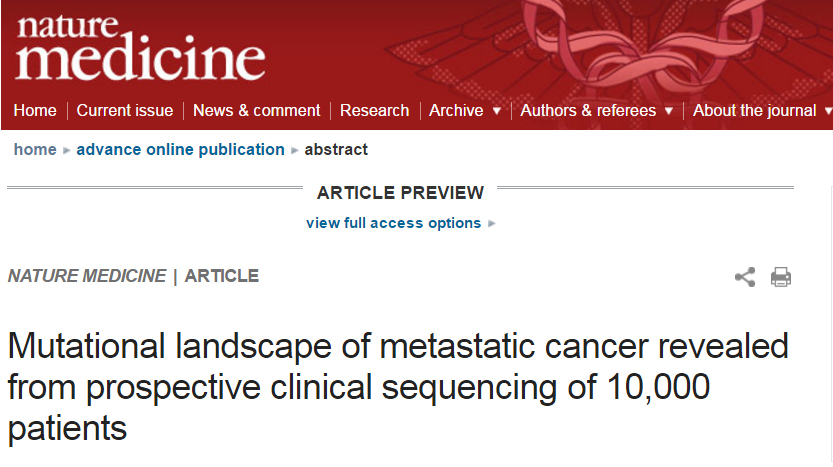 5月8日,Nature Medicine杂志在线发表了一篇“大作”,科学家们采用综合法——MSK-IMPACT开展了一个大规模的、前瞻性的临床测序项目,收集了10000多名晚期癌症患者的肿瘤及正常组织DNA序列、病理以及临床注释等各方面的数据。使用这些数据,他们确定了临床相关的体细胞突变、新的非编码区突变以及常见肿瘤与罕见肿瘤共享的突变标签。让人兴奋的是,研究人员将所生成的数据集对外共享(共享网址:http://cbioportal.org/msk-impact),使人们能够发现新的生物标志物以及针对罕见突变开展更深入的研究。 它能够检测与癌症相关的410个基因
