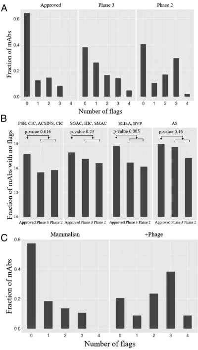 ▲FDA批准的全人源单克隆抗体及其使用的技术(图片来源:福布斯) 从研发手段来看,我们可以从两种常见的方法里获得全人源化的抗体。第一种方法是小鼠免疫平台,让小鼠表达人类抗体的可变段、多样段和连接段序列(VDJ antibody sequences),并对它们进行免疫接种;第二种方法是“噬菌体展示”(phage display),在大规模的抗体库中进行筛选。这两种技术平台都各有利弊。对于第一种方法来说,它能利用多样性、表达量与稳定性等体内因素来助力筛选,但它的抗原性可能激发免疫反应,成为一个问题。此外,在研究人员需要进行反向筛选的情况下,这些小鼠也不易构建。而第二种方法则基本上与第一种方法截然相反。 从目前的数据来看, FDA批准的23款全人源抗体中,有近乎四分之三使用的是小鼠免疫的手段,其中使用Medarex公司开发的UltiMab技术的获批抗体达到了10款,这包括了重磅免疫疗法药物Nivolumab(商品名Opdivo)。 这一现象可能是由于在研发的过程中,“噬菌体展示”技术带来的抗体其不确定性更大一些。2017年,麻省理工学院(MIT)的知名教授Dane Wittrup与同事们发表了一篇详尽的论文,统计了大量抗体在临床研发上的数据,并评估了这些抗体的粘性(自我结合与交叉结合能力)、疏水性、蛋白复合体形成能力、热稳定性、以及重组表达的水平。利用目前已上市的抗体,研究人员制作了一系列“标准曲线”。一旦某一个抗体的数据位于该曲线最差的10%范围内,研究人员就为它做一个标记。研究发现,比起已获批上市的抗体,处于2期临床试验的标记数要多得多,这很容易理解。在新药研发的过程中,在研药物的一些特性,总是逐渐变得越来越好。然而有趣的是,研究也发现,利用“噬菌体展示”技术带来的抗体,被标记的概率显著高于从哺乳动物体内获取的抗体。