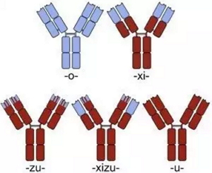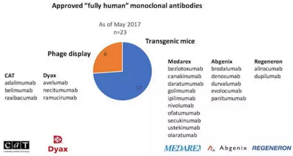 ▲嵌合(右上)、人源化(左下)和全人源(右下)单克隆抗体。人源部分为红色,非人源部分为蓝色。(图片来源:wikipedia) 尽管非完全人源化的抗体依旧将在未来占据重要的一席之地,全人源的抗体正在变得越来越常见。自从Humira这首款全人源的单抗在2002年获批以来,美国FDA已经批准了23款全人源的单抗,占到了市场上所有单抗的40%。2015年至今,21款单抗中有11款是全人源的抗体。而在2017年获批上市的5款抗体中,更有4款是全人源抗体。这或许也反映了未来单抗发展的趋势。