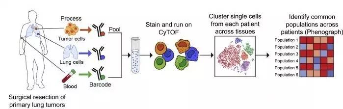 诸如PD-1和PD-L1免疫检查点抑制剂等肿瘤免疫疗法在治疗晚期或转移肺癌中已经取得了巨大的成功。但是目前治疗早期肺癌的标准疗法仍然是手术和化疗,那么肿瘤免疫疗法能否用于治疗早期肺癌呢? 日前,美国西奈山医学院(Mount Sinai School of Medicine) 的研究人员对早期肺癌肿瘤的免疫微环境进行了详细研究。他们发现让肿瘤免疫疗法得以成功的免疫因素在早期肺癌的微环境中已经存在,这意味着免疫疗法很有希望在早期肺癌患者身上同样取得成功。这项研究发表在《细胞》杂志上。 目前,治疗早期肺癌患者的常用疗法仍然是手术治疗和辅助化疗。处于IA和IB期的早期非小细胞肺癌患者接受治疗后5年存活率分别为83%和71%,而处于II期的患者存活率就只有50%。这说明对早期肺癌的治疗仍然有很大的提升空间。虽然PD-1或PD-L1抗体这类免疫检查点抑制剂在治疗晚期肺癌方面已经显示出优异的疗效,但是它们并没有被用来治疗早期肺癌患者。其中的一个重要原因是我们对早期肺癌肿瘤附近微环境的免疫状况并不了解。免疫检查点抑制剂能否成功,取决于肿瘤周围是否已经存在着可以杀伤肿瘤的免疫细胞,以及这些免疫细胞的抗癌能力是否受到了PD-1或PD-L1等免疫检查点蛋白的抑制。因此,了解早期肺癌肿瘤微环境的免疫状况非常重要。 西奈山医学院的研究人员从早期肺癌患者身上获取了切除的肿瘤组织、正常肺部组织和血样。他们设计出一种条形码系统可以对这三种不同样本中的所有细胞用金属同位素贴上标签。然后运用飞行时间质谱技术 (mass cytometery by time-of-flight)与单个细胞转录组学(single cell transcriptomics)和对肺部肿瘤的多重成像技术相结合,对肺部肿瘤的免疫状况在单个细胞的水平上进行详细分析。