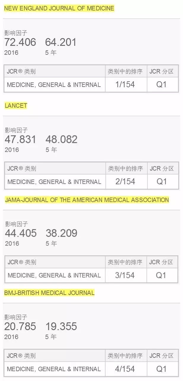 4. 四大医学期刊 与往年相比,NEW ENGLAND JOURNAL OF MEDICINE、LANCET、JAMA-JOURNAL OF THE AMERICAN MEDICAL ASSOCIATION、BMJ-BRITISH MEDICAL JOURNAL的IF均有所上升!