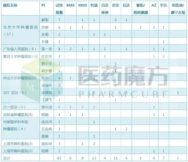 表3 各公司PD-1/PD-L1药物在国内开发的适应症 从表3可以看出,肺癌是“大”适应症,有5家企业将非小细胞肺癌作为适应症,以往极少有企业涉及的鳞状非小细胞肺癌和小细胞肺癌也都分别有2家开展了相关试验,但国内企业没有涉及小细胞肺癌;晚期肝细胞癌也有4家企业涉及,但国内企业只有恒瑞开展;食管鳞癌、胃腺癌、泌尿系统肿瘤分别有4家国内外企业开展;复发或难治性经典型霍奇金淋巴瘤只有3家国内企业开展;黑色素瘤有3家企业开展。 三阴性乳腺癌是君实的开发重心,已经开展了3个I期试验:单药治疗、联合放疗和联合吉西他滨。恒瑞则在非小细胞肺癌上投入重兵,开展了2个II期试验(联合阿帕替尼治疗一线化疗失败和和二线单药)和1个III期试验(联合培美曲塞和卡铂一线治疗)。 04、研究中心 曾经有句玩笑话:这么多PD-1产品陆续开展临床试验,中国的病人不够用了,研究者也不够用了。虽然是玩笑话,但反映出好的研究者是稀缺的和受追捧的。