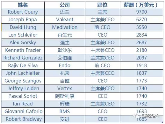 2016全球药企CEO收入最高前十五名 来源:FiercePharma 本文转载自“E药经理人”。 1、加薪要自己争取! Robert Coury,迈兰主席 2016年薪酬:9700万美元 2016年对于迈兰来说堪比做过山车。给产品大幅提价让它被美国民众骂翻,国会听证会,联邦政府调查一个没落下。不过这显然没对迈兰董事会主席Robert Coury的补偿金有任何影响。部分原因在于他在由执行主席变成非执行主席时获得的各类补偿以及一笔高达2000万美元的绩效激励奖金,这一份奖金超过榜单上所有老板的奖金总和。 这里不得不说Coury聪明之处。在2014年同意出任迈兰董事会主席时,他跟公司谈了一份新合同。按照合同,如果Coury“圆满履行了关键领导职责,并且直到2016年底仍然被迈兰聘用”,他就可以拿到2000万美元的绩效激励奖金。看吧,最后能拿多少钱,都是跟公司谈出来的! Coury在2016年的基本收入包括163万美元年薪,148万美元期权和95万美元奖金。 此外,Coury还有价值超过5000万美元的股票奖励。很多机构投资人觉得他拿的太多,因此号召其他股东一起反对他连任董事会主席。但不管股东怎么反对,Coury的这笔巨额工资已经是板上钉钉。 Joseph Papa,Valeant主席兼CEO 2016年薪酬:6270万美元 自去年起接任Valeant公司CEO职位的 CEOJoseph Papa 在2016年能获得如此高收入,一个重要原因是里面有4200万美元的股票。当时的Valeant情况已经不能用糟糕来形容。核心产品销售增长缓慢,公司巨额欠款偿还不力,而且还因为低价买入老产品然后大幅涨价以及强硬收购公司,被公众和投资人唾弃,股价仅用一年时间便从101美元每股跌至15美元以下。 可见 Valeant当时也是下了血本才请动了他。除了股票,Papa的年薪是98万美元,公司还给了他910万美元的现金奖励。这里边有800万美元是为了感谢Papa接受这一职位。这笔“感谢费”相当于他在之前公司一年收入的一半。 David Hung,Medivation前CEO 2016年薪酬:3550万美元 David Hung的2016年简直不能更爽,他一度成为美国生物医药圈中最火的CEO,因为谁都一众巨头都想买了他的公司Medivation。最终,靠着公司的前列腺癌药物Xtandi和它包括一款PARP抑制剂在内的产品线,Hung以作价140亿美元把公司卖给了辉瑞。 高溢价让Medivation乐开了花,而Hung就是其中的占大头的一个,公司为回报他作为领导人以及在促成辉瑞交易中的作用,奖励他3550万美元。不过,这跟他握在手中的Medivation股票相比就太少了。Hung有284万公司股,按照公司交易时的价格计算,合计价值高达1.82亿美元。 虽然被辉瑞买走后的Medivation表现欠佳,但这已经跟Hung没什么关系了。现在的他,已经加盟一家主攻一款阿尔茨海默治疗药物的生物科技公司,这一产品来自GSK。他要在这家公司再现Medivation式的神迹也说不准。 Len Schleifer,再生元CEO 2016年薪酬:2834万美元 2016年并没有像Len Schleifer在年初预期的那样美好。公司的PCSK9胆固醇药物远未到达之前的“重磅炸弹”预期。在该领域和安进的对抗中,再生元还失去了这一产品的一项专利。FDA还拒掉了再生元的一款类风湿性关节炎类药物。这些都让再生元的投资者很炸毛。再生元的股价从2010年以来的飙升在2015年底戛然而止,并且一直跌到2016年的367美元每股。2016年,再生元市值减少了32%。 所以,作为老板的 Schleifer只拿到了绩效奖金和期权奖金。而且期权奖金虽然只少了15%,但实际价值却比2015年的时候少了43%。2016年,Schleifer的基础年薪是124万美元,绩效奖金是224万美元。 Alex Gorsky,强生主席兼CEO 2016年薪酬:2687万美元 强生的制药业务在过去几年一直有新产品上市,处方药业务相比于医疗器械和OTC产品也在逐季增长。2016年,强生制药业务增长6.5%,达到335亿美元。其中,与艾伯维共有的血液肿瘤治疗药物Imbruvica已经显示出“超级重磅炸弹”的潜质,在2016年已为强生带来12亿美元的销售。EvaluatePharma预测该药在2022年将成为全球最畅销肿瘤药第三名,预期销售额高达82.9亿美元。 所以Gorsky的绩效奖金和期权回报都要高于2015年,分别是378万美元和1684万美元。此外,达成绩效目标后,他还获得465万美元的激励奖金,1060万美元的股票奖励和412万美元的期权奖励。Gorsky的基础年薪是160万美元。 但2016年不都一帆风顺。强生的核心品种类克受到了越来越多生物类似药的挑战,而这一趋势在2017年会对强生产生的影响还有待观察。 2、绩效没达成一样降薪! Kenneth Frazier,默沙东,主席兼CEO 2016年薪酬:2180万美元 默沙东在2016年给Ken Frazier涨了一点点底薪,涨了2.5%到153万美元。这点钱只是Frazier全年薪酬的十分之一,大头来自于绩效奖金。不过2016年,他的绩效表现就不太好了,离年初定下的销售业绩目标差了3个亿美元。 所以,Frazier在2016年的收入直接被降了300万美元,整体薪酬为2178万美元。 除了销售业绩平平,默沙东在产品线上的表现也没给Frazier加分。最亮眼的只有Keytruda,这个全球首个被FDA批准用以治疗非小细胞肺癌的PD-L1抑制剂。该产品在2016年的销售额增长148%,达到14亿美元。 但很明显,Keytruda再亮眼也不能撑起整个默沙东。新上市、用以治疗丙肝的Zepatier在2016年只有5亿美元的销售,更何况这个领域除了有吉利德还有一众大公司在这个不断消失的市场中厮杀夺食。类克在欧洲市场被生物类似药步步紧逼,销量在2016年逐季下降,全年降幅达29%,只有12.6亿美元。 所以Frazier想通过并购扩充默沙东的产品线,这让董事会看到了他的努力,所以就手下