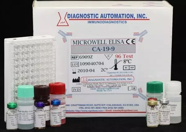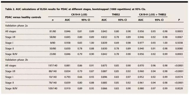 CA19-9检测试剂盒,使用酶联免疫吸附测定法(enzyme linked immunosorbent assay,ELISA) 既然单独的不可以,那么如果将这两个效果都不错的蛋白结合使用呢?不得不说,这个想法可真的帮了大忙了,因为综合两种蛋白检测后,PDAC和早期PDAC诊断的AUC值分别达到了0.956和0.946! 这样来看,CA19-9和THBS2联合使用似乎是最好的选择,于是第二组验证实验(phase 2b)开始了。这组试验增加了样本数量,共包括539名患者,在这一组中,CA19-9和THBS2联合使用的AUC值与第一组相似,也达到了0.97和0.96。这个检测方法的敏感度达到87%,特异性超过了98%!无论是早期还是中晚期,新方法检测的AUC值都超过了0.95。