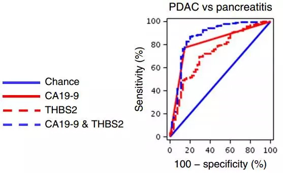 两组验证试验中,CA19-9、THBS2以及CA19-9联合THBS2区分不同阶段PDAC的AUC值对比 而且,研究人员经过比对健康人和不同阶段PDAC患者血液中的THBS2的水平,初步给出建议,判定PDAC的临界值为42 ng/ml。 我们前面提到过了CA19-9的一大问题就是在PDAC和非癌变的胰腺炎等疾病中也会异常升高,大大影响了它作为标志物的准确度。于是,研究人员再次进行了实验,他们希望THBS2和CA19-9联合使用不会重蹈CA19-9的覆辙。 事实表明,THBS2和CA19-9联合确实提高了区分两种疾病的准确度,2a组和2b组的AUC值分别从0.774和0.816(CA19-9单独使用)提高到了0.842和0.867。