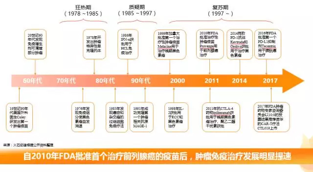 肿瘤免疫治疗发展增速 所谓肿瘤免疫治疗,是指在治疗过程中直接或间接利用人体免疫系统对肿瘤患者进行有效治疗的方法。人类对其的研究在经历了20世纪的狂热期和质疑期后,在21世纪逐渐进入复苏期,自2010年FDA批准首个治疗前列腺癌的肿瘤疫苗Provenge后,肿瘤免疫治疗发展明显加快。