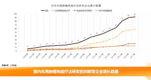 从国内研发企业累计数量分析,在经历了2015年相对快速的增长后,企业新增数量趋缓。其中布局过继细胞免疫疗法的企业数量相对其他两个细分领域较多。