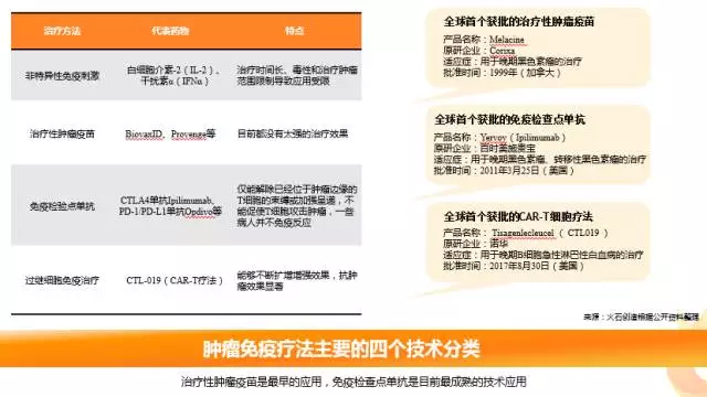 治疗性肿瘤疫苗、免疫检查点抑制剂、过继细胞免疫治疗是目前主要技术分类。其中治疗性肿瘤疫苗是领域内最早的应用,全球首个治疗性肿瘤疫苗Melacine由Corixa公司原研,于1999年在加拿大上市,用于晚期黑色素瘤的治疗。而免疫检查点抑制剂是目前领域内应用最成熟的一类。Yervoy是由百时美施贵宝研发的,于2011年在美国上市的全球首个免疫检查点抑制剂,用于治疗黑色素瘤。今年8月30日,全球首个CAR-T细胞疗法Tisagenlecleucel比预计时间提早一个月获批。