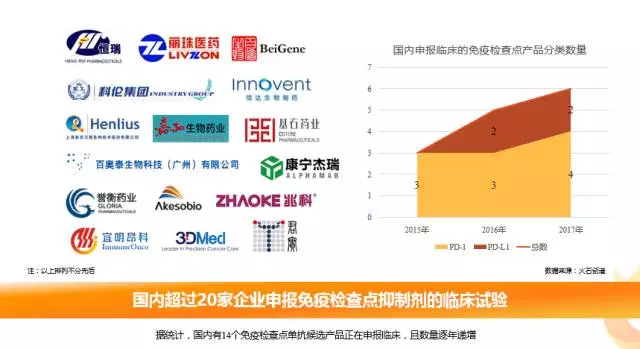 目前国内超过20家企业正在申报免疫检查点单抗候选产品的临床试验,研究的靶点基本集中在PD-1/PD-L1,且申报临床的数量逐年增加。