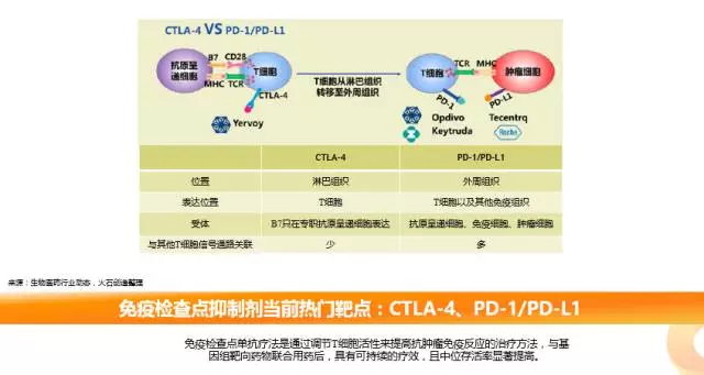 免疫检查点单抗 免疫治疗未来核心所在 免疫检查点单抗疗法是通过调节T细胞活性来提高抗肿瘤免疫反应的治疗方法。目前热门靶点包括CTLA-4、PD-1、PD-L1等,与基因组靶向药物联合用药后,具有可持续的疗效,且中位存活率显著提高。