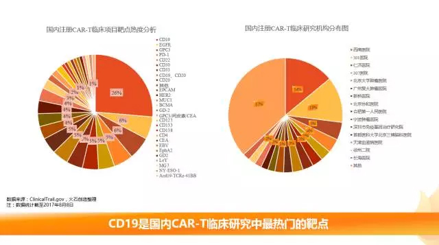 从国内在ClinicalTrial上注册的临床项目分析,CD19是临床研究中最热门的靶点,占到总数的26%。开展临床最多的医疗机构主要是第三军医大学西南医院、中国人民解放军总医院301医院、上海交通大学医学院附属医院仁济医院等。