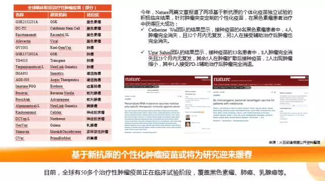 目前,全球有50多个治疗性肿瘤疫苗正在临床试验阶段,覆盖黑色素瘤、肺癌、乳腺癌等。今年,肿瘤疫苗的研究有了可观的进展。Nature的两篇文章报道了两项基于新抗原的个性化疫苗独立试验的积极临床结果,针对肿瘤突变定制的个性化疫苗,在黑色素瘤患者治疗中获得巨大成就。