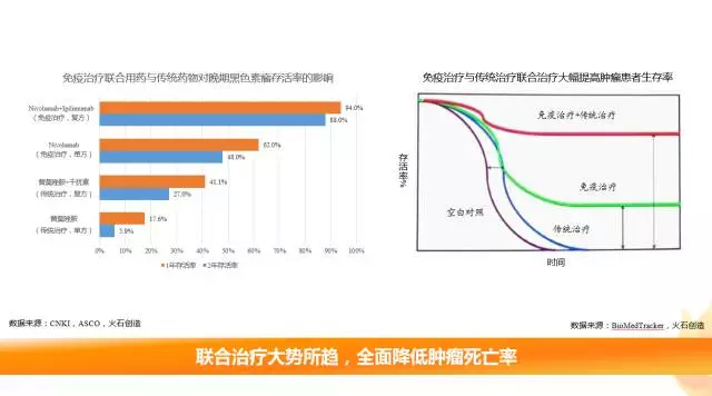 “免疫治疗+”将成为未来趋势 早前,肿瘤免疫治疗大多作为三大疗法之后才考虑的辅助治疗方案,用于维持肿瘤稳定,降低放化疗的副作用。随着研究和临床试验的深入,目前临床上大多将免疫疗法联合药物治疗,改善患者免疫功能,清楚肿瘤微小残留,延长总生存期。越来越多的临床试验结果证明,免疫治疗联合用药与传统药物相比对肿瘤存活率的提高约达一倍之余。