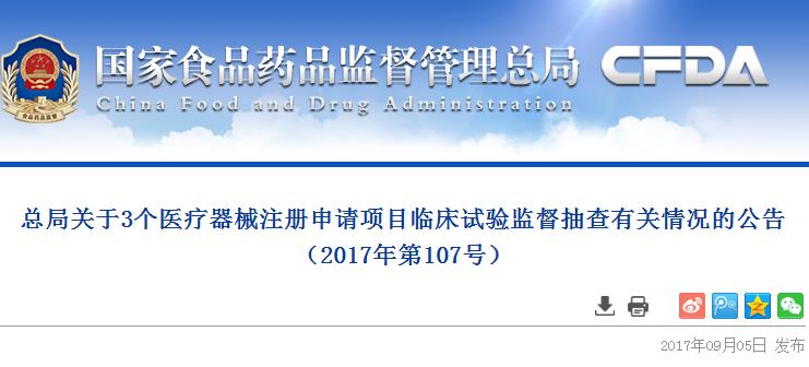 按照《关于开展2017年医疗器械临床试验监督抽查工作的通告》(国家食品药品监督管理总局通告2017年第103号),2017年7月23日—30日,国家食品药品监督管理总局组织开展了第一批医疗器械临床试验监督抽查,检查发现3个注册申请项目的临床试验存在真实性问题。现将有关情况公告如下: