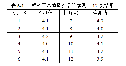6第六章 室内质控应用流程绘制质控图主要是通过质控品测定值在图上的分析发现有无异常因素存在,以达到监测检测过程是否稳定的目的,在开始室内质控时,首先要确定质控图的均值来设定质控图的中心线。对新批号质控品的各个测定项目自行确定均值。为了确定均值,新批号的质控品应与当前使用的质控品一起进行测定。根据20次或更多独立批获得的至少20次质控测定结果,计算出平均值,作为暂定均值。以此暂定均值作为下一个月室内质控图的均值进行室内质控。一个月结束后,将该月的在控结果与前20个质控测定结果汇集在一起,计算累积平均数(第一个月),以此累积的平均数作为下一个月质控图的均值。 设定标准差,为了确定标准差,新批号的质控品与当前使用的质控品一起进行测定,根据20次或更多独立批获得的至少20次质控测定结果,计算出平均数和标准差。以此暂定均值和标准差作为下个月室内质控图的均值和标准差进行室内质控。一个月结果后,将该月的在控结果与前20个质控测定结果汇集在一起,计算累积均值和累积标准差(第一个月),以此累积平均数和标准差作为下一个月质控图的而均值和标准差。 重复上述操作过程,连续三至五个月。以最初20个数据三至五个月在控数据汇集的所有数据计算的累积平均数和标准差作为质控品有效期内的常规均值和标准差,并以此作为以后室内质控图的均值和标准差。 对于稳定性较短的质控品,均值的建立可以三至四天内,每天分析每水平质控品三至四瓶,每瓶进行2至3次重复。收集数据后,计算平均值、标准差、变异系数。对数据进行离群值检验。如果发现离群值,需要新计算余下数据的平均数和标准差。以此均值作为质控图的均值,至于标准差,可采用以前变异系数CV来估计新的标准差。 如果要跟换新批号的质控品时,应在旧批号质控品使用结束前与旧批号质控品一起测定,重复以上的过程,设定新的均值和标准差。 临床生化实验室最常用的是Levey-Jennings质控图。1924年,美国W.A.Shewhart首先提出质控图的概念。在此之前人们曾试图采用各种方法来预测质量变动的预兆,但均未获成功。20世纪50年代,Levey和Jennings把质控图引入到临床实验室中。后经Henry和Sgalove改进后,以20份质控品的试验结果,计算均值(X)和标准差(S),以X±2S为警告限,以X±3S为质控限。每天或每批随患者标本测定质控品一次,将所得的质控结果标在质控图上。也就是目前大家所熟悉的Levey-Jennings质控图,简称“L-J质控图”。如图6-1。 Levey-Jennings质控图具有基本的统计学意义,在稳定的条件下,在20个质控品的测定结果中不应有多于1个结果超过2S限度,也就是95.5%的可信限。1000个测定结果中超过3S限度,99.7%的可信限的结果不多于3个,如±3S位失控限,假失控的概率为0.3%。 我们仍然以钾这个生化项目为例,连续将钾的正常值质控品连续测定12次,计量单位为mmol/L,结果如下: 根据计算均值的公式可得,X=4.1;根据计算标准差的公式可得,S=0.1。 那么,X±1S的范围为4.0~4.2mmol/L;X±2S的范围为3.9~4.2mmol/L;X±3S的范围为3.8~4.4mmol/L。 根据以上数据绘制Levey-Jennings质控图,如图6-2。 可以看到将质控检测值直接在图上画出,而不需要增加其他的计算步骤,非常的方便,这就是Levey-Jennings质控图。 依据统计分布规律,新的质控值应与以往的质控值具有相同的分布。当质控值落在12S或13S内,可以认定本批质控结果在控,病人结果可以发出。若超出了控制限,即本批结果失控。关于失控的判断有以下几点: 1. 每日做1个质控品的检测,只要有质控值超出12S限值的即可确定为失控。 2. 每日做2个质控品的检测,只要有质控值超出13S限值的即可确定为失控。 3. 两个水平质控品中任一个的质控值超出13S限值,即确定为失控。因为出现超出13S限值的可能性很小仅为0.3%,一旦出现,说明都是存在真实问题的表现。 4. 两个水平质控中任一个质控值超出12S限值,作为警告,继续观察。 但是,通过Levey-Jennings质控图判断失控也有其局限性,如±12S质控限的L-J质控图,当每批使用2个质控品时,它的假失控率往往是不可接受的,使用±13S质控限时此质控方法虽然具有较低的质控假失控率,但是其误差检出能力大打折扣,很难确保检验结果的质量。正由于这个局限性,临床生化检验质控方法在不断的发展,现在出现了许多更加精确、更完善的质控方法,如Westgard多规则质控方法。 用Levey-Jennings质控图判断失控虽然简单易行但有其局限性,判断的结果不是很精确、也不够完善。James Westgard博士将其进行了改良,设计了表达质量控制规则的简化符号,在Westgard的设计中,有6个基础规则。这些规则可以分别或结合使用,评价分析批的质量,也就是Westgard多规则,采用该规则,当质控数据满足规则要求的条件时,则判断该分析批违背此规则。常用的质控规则有: 22s:同一个水平的质控品连续2次质控值同方向超出X+2S或X-2S,是失控的表现;在同批次,2个水平的质控值同方向超出X+2S或X-2S,是失控的表现,违背此规则表示存在系统误差。 R4S:这个规则仅证实随机误差,仅用于最近这批的批内判断。若一批内两个质控品的质控值间,至少有4s的差异,符合本规则,为随机误差。如果发生在2批检测中,就不是该多规则的R4S。 41S:有连续4次的质控结果超出了X+1S或X-1S的限值,违背此规则表示存在系统误差。该规则有两种表现形式,一种是一个水平的质控