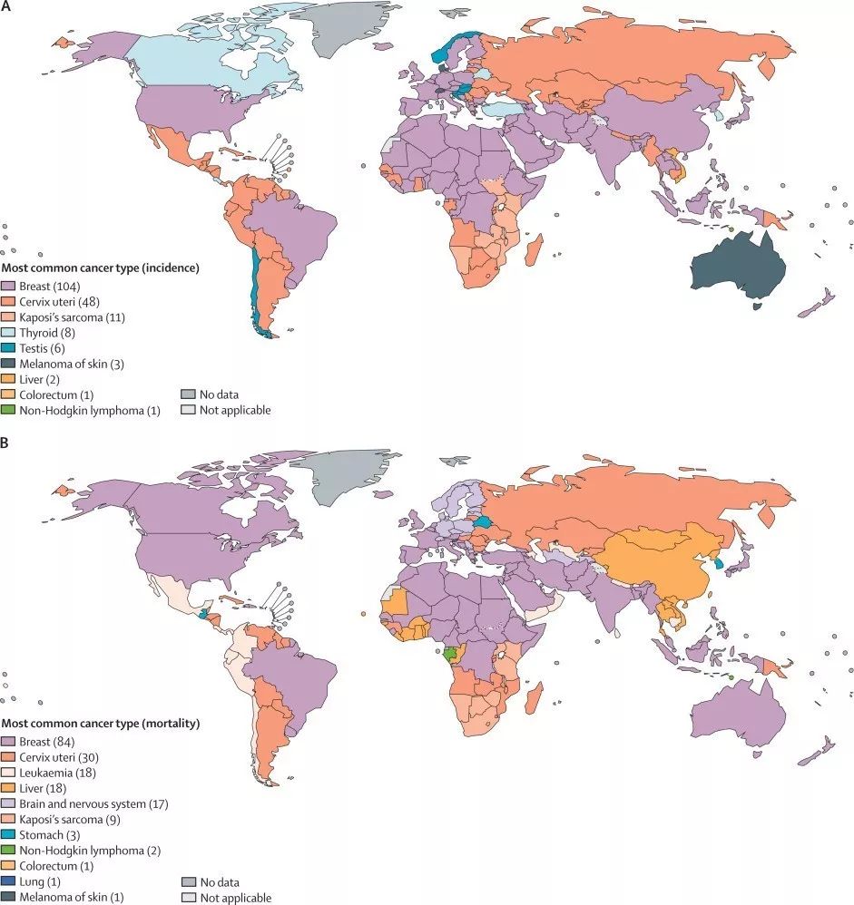 图2. 2012年全球各国20-39岁年龄段最常见癌症的新发病数(A)及死亡数(B)分布