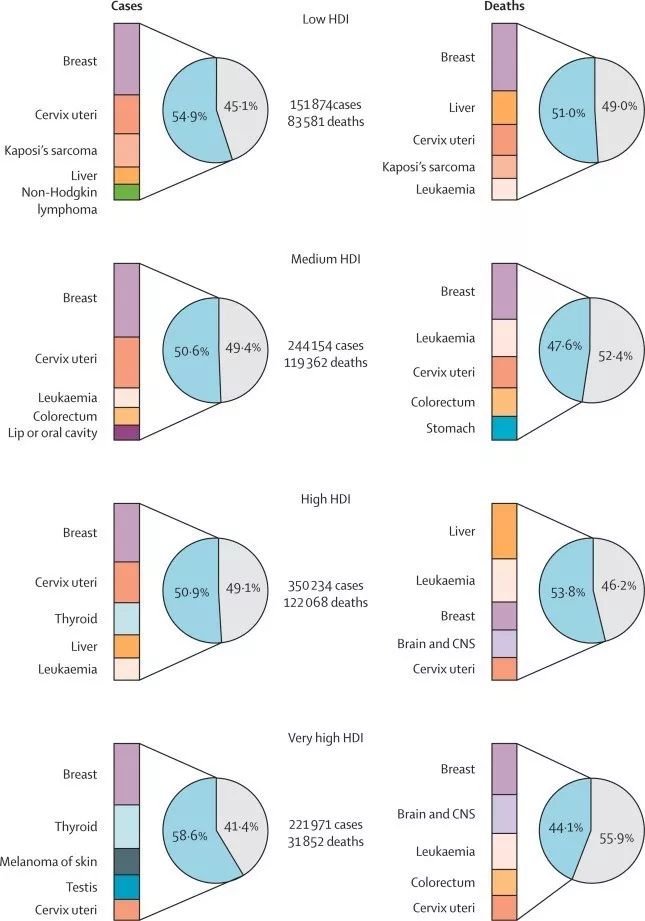 2012年,全球年轻女性癌症负担所占比例高于男性。从新发癌症而言,年轻人中最常见的新发癌症是女性乳腺癌、宫颈癌、甲状腺癌、白血病和结直肠癌。从癌症相关死亡而言,女性乳腺癌、肝癌、白血病和宫颈癌相关死亡占比高。
