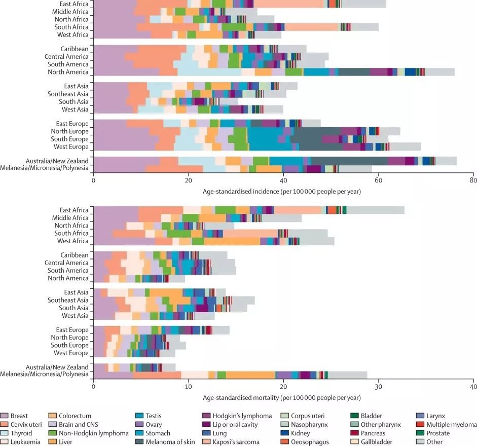 图5. 2012年全球不同地域20-39岁年龄段各癌种年龄标化发病率(A)和死亡率(B) (单位:/万人•年) 原文链接: http://www.thelancet.com/journals/lanonc/article/PIIS1470-2045(17)30677-0/fulltext |