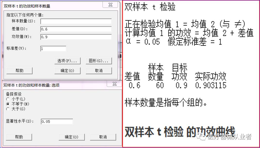 [备注354例样本数与教科书上公式计算得出的结果吻合,其结果解释:可认为需要治疗54例矽肺病人,如果该药确实能增加尿矽排出量,则有90%(即1-β)的把握可得出有差别的结论]