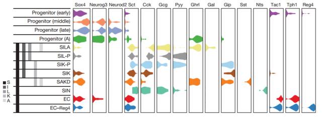 除此以外,研究者还提出了新的小肠内分泌细胞分类标准。以往科学家们认为,小肠内的一种内分泌细胞只能分泌一种激素。但是研究者发现,实际上这些细胞还是很多才多艺的,一种内分泌细胞实际上可以分泌多种激素,难怪以前有些研究对不上呢!他们根据分泌激素的种类,提出了新的分类法,为以后研究提供了更详细的理论依据。 纵轴为新分类细胞,横轴为所分泌激素 图注为原分类 拍完了小肠细胞的“证件照”,“生活照”也不能放过,毕竟人体可是动态的,小肠时刻要面对着外来病原体的威胁。研究者采用了沙门氏菌(Salmonella enterica)和多形螺旋线虫(Heligmosomoides polygyrus)两种经典模型,分别模拟了小肠细胞对病原菌和寄生虫的反应。