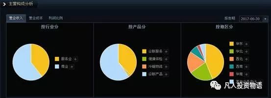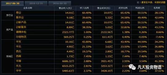 主营构成分析图表如下: 相关数据如下: 从迪安诊断的主营构成看,诊断产品和诊断服务是公司主营占比最高的业务,合计超过95%,它们是公司业绩的主要来源,健康体检与冷链物流是新的业务发展点,但是占比一直不高,还有较大发展空间。