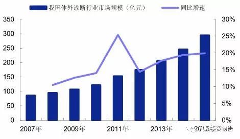 中国的体外诊断(IVD)市场起步晚,但成长速度较快。2008-2012 年,中国体外诊断市场规模增速显著高于全球平均水平,年复合增长率将保持在16%左右。据统计测算,2015年我国体外诊断市场规模约为287亿元(其中诊断仪器市场为79亿,诊断试剂为208亿)。 2007—2015我国体外诊断市场规模图