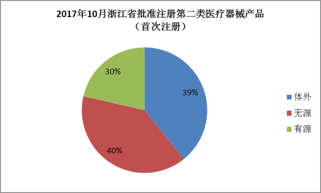 2017年10月,浙江省食品药品监督管理局共批准注册第二类医疗器械产品110个,其中首次注册28个,包括有源类6个,无源类11个,体外诊断试剂11个;延续注册82个,包括有源类2个,无源类5个,体外诊断试剂75个。