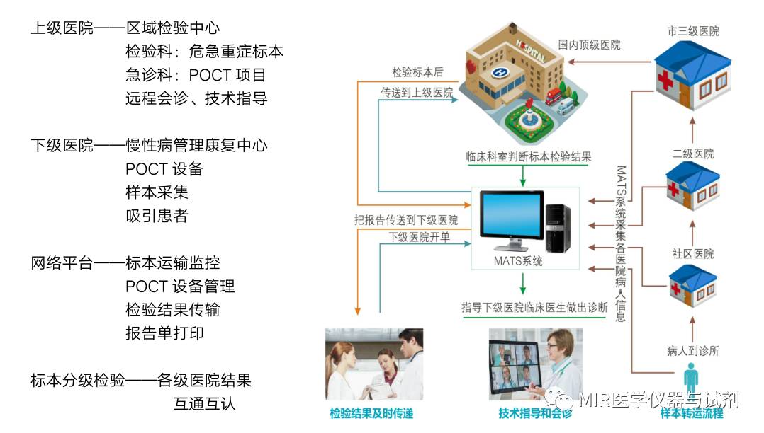3)POCT在社区卫生服务站或中心的发展机遇:由冷变热,常见病、多发病、慢性病的POCT数量明显增加。 4)POCT在家庭和个体化诊疗中的发展机遇:互联网+:POCT+移动医疗在家庭和个体化健康管理、疾病预防控制、慢病管理等方面引来井喷式的发展机遇。 3.POCT在分级诊疗中发展模式区域检验中心MATS系统定义: 以地区知名度最高的医院为顶层医院,把该院医技科室设置为地区医学检验质量控制中心,通过区域检验质量管理系统(MATS)以医学检验为基础对接区域医院HIS、LIS、EMR系统。由此上级医院指导下级医院提高医学检验质量和慢病管理水平,同时改善危重病人的救治流程。 由成都慧生智医疗技术有限公司开发MATS系统搭建分级诊疗平台,POCT在分级诊疗运行模式如图: 案例 例如四川某地区,当地基层医院孕妇基本上要查甲功,基层医院投入了能满足临床需要、结果达标、成本较低POCT设备,由上级医院通过网络平台管理其下级网络医院的这些POCT设备。三级医院开展产前诊断等高值、高端项目,通过下级网络医院收集标本、专业的物流运输服务商建立本地区临床检验检查中心。 形成了符合本地区的一条分级诊疗道路:三级医院建立区域的临床检验中心,基层网络医院和三家医院急诊科、ICU使用POCT,通过专业网络平台,保障常规样本,县级样本不出县、市级样本不出市;非常规样本,在社区或者县级采血,三级医院检验,出报告;让患者在家门口,能享受三级医院的检验服务。让三级医院接收更多高质量的标本,并管理下级网络医院POCT质量;让下级和社区医院吸收更多的患者。 五 分级诊疗与POCT未来展望 基层医院技术水平欠缺,病人少,常规项目检验少;由于大部分项目外送,没有足够的标本,进一步造成基层医院技术水平低,基层环境条件留不住人才;三级医院委派人员成本高,不是可持续的方案。 提高基层医院服务能力,首先要解决的是吸引患者。通过网络平台,上级医院与下级医院合作,把非常规项目,基层医院作为采血机构,上级医院作为区域检验中心,检验出报告,各级医院充分发挥各自实验室优势,是一种可行的解决方案。 POCT未来发展趋势:小型化、网络化、自动化、标准化。相信随着在分级诊疗发展潮流下,POCT网络化管理是必然的趋势。 分级诊疗的重点是"提高基层医院的服务能力",做到“小病不出村、常见病不出乡、大病不出县”研发出符合国情、满足要求且的POCT设备,实现基层医院是慢性病管理中心和区域的康复中心,体现个性化治疗。 |