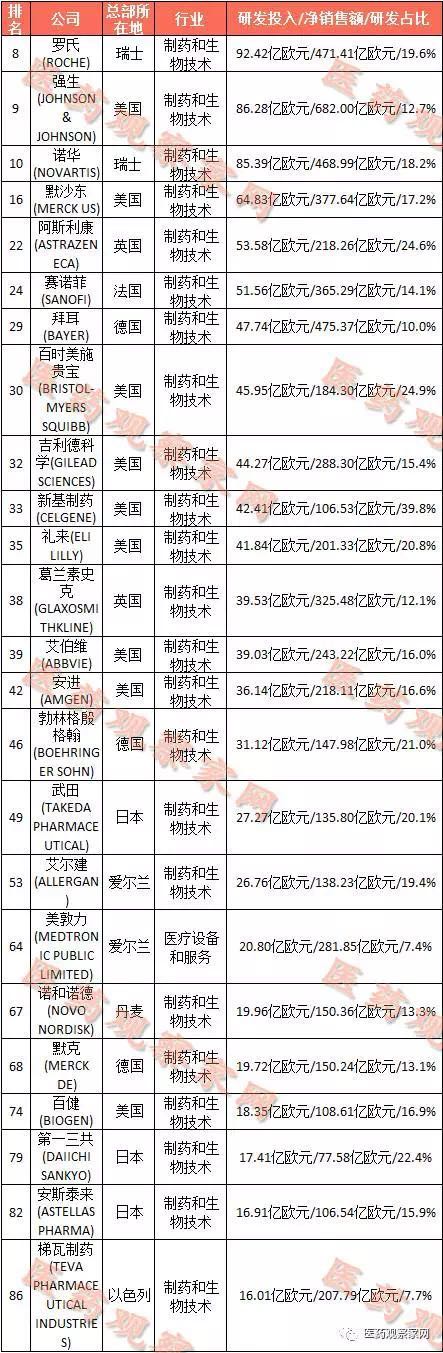 第一名是罗氏,研发投入是92.42亿欧元,总排名第8;