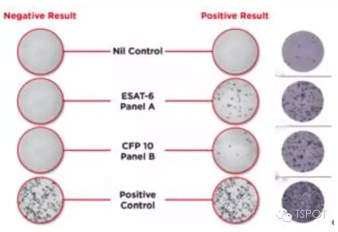 图左:T-SPOT.TB阳性与阴性结果的对比度。图片来源:http://www.tspot.com/about-the-test/; 图右:T-SPOT.TB强阳性的结果图,肉眼计数情况下,目前我院报告中均会体现A孔和B孔的具体数目。 图片来源于复旦大学附属华山医院感染科实验室,国内最早开展T-SPOT.TB检测的实验室之一 。 T-SPOT.TB方法检测浆膜腔液中的T淋巴细胞,可以作为结核性浆膜腔炎诊断的新方法,其最佳临界值为14(A孔或B孔),当浆膜腔积液T-SPOT.TB与外周血T-SPOT.TB二者的斑点形成细胞数之比大于1时,更倾向于诊断结核性浆膜炎。(参考文献:PLOSONE: Utility of T-Cell Interferon-c Release Assays for Diagnosing TuberculousSerositis: A Prospective Study in Beijing, China)