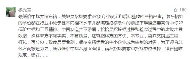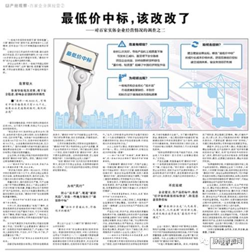 导语 不到一个月的时间里,《人民日报》两次发文诟病“最低价中标”,实为罕见!建设工程质量因“最低价中标”问题频发,使得整个行业怨声载道,也在给业内人士敲响警钟:“最低价中标”原则一天不变,行业就很难有什么工匠精神,更不要说什么中国品牌!” 2017年5月31日,《人民日报》发文《质量应是企业立身之本(一线视角)》,首次诟病最低价中标。 “在招投标中,低价就能中标,造成大家不比质量,只比价格低。”在不久前开展的全国人大常委会产品质量法执法检查中,一些企业主抱怨,目前,一些地方在招投标中存在的“低价中标”现象,已经成为企业提升产品质量的突出障碍,亟待治理和规范。 一般情况下,按照市场规律,招投标中的投标价或中标价不得低于成本价。然而在现实中,部分招标单位在招标环节忽视质量要求,唯价格论,造成中标价低于甚至远低于成本价。这些以低于成本价中标的企业,为获取利润,只能在原材料采购、生产制造等方面压缩成本,以牺牲产品质量来弥补亏损,从而出现“劣币驱逐良币”现象。在执法检查中,一家曾经获得过“政府质量奖”的线缆企业直言:生产企业没有利润空间,被逼得偷工减料,突破底线。事实上,因低价中标导至产品质量不过关,甚至酿成安全事故的案例,并不鲜见。 “低价中标”现象之所以出现,和法律法规执行不严、监管机制不完善有一定关系,而从根源上讲,是鼓励优胜劣汰的竞争环境不足导至的。当有的企业每年拿出很多利润来搞研发、创新,提升产品质量时,个别企业靠偷工减料、假冒仿制也能同台竞技,甚至竞争成功。长此以往,就没有企业愿意花精力搞研发和创新。这不仅严重扰乱了市场经营秩序,对整个制造业也是一个打击。解决之道,自然是进一步完善市场环境,让企业拿产品质量说话,让过得硬的产品叫得响、站得稳,从而为制造业大国打下产品质量的基础。 令人慰藉的是,在今天的中国市场上,靠偷工减料甚至假冒伪劣来获利,空间正日益逼仄。一方面,目前,随着监管部门从标前、标中到标后的全流程监管,招标投标活动逐步规范化,通过低价中标进而谋求灰色利益的可能性被大大降低。相反,一些低价中标的企业经常由于利润极低,造成交期延迟,且无法保证质量,让招标方付出了更高的代价。在工程领域,有人将这一现象戏称为“饿死同行、累死自己、坑死业主”。另一方面,随着中国制造业的整体转型,在产品质量上不愿意投入的企业,生存也将愈发艰难。我们应该顺应和把握好这一有利于提升产品质量的趋势,使现行法律规定更具可操作性,维护优胜劣汰的市场规则,使守法企业一路绿灯、违法企业处处受阻,让企业主动对产品负责、对消费者负责、对社会负责。 质量是企业的立身之本。我国产品质量法也规定,企业要承担产品质量的主体责任。提升产品质量归根到底要靠企业自身,只有一件件产品都有质量、一家家企业都以质量为目标,经济发展才更有质量。当前,中国市场正在实现消费升级,产业结构正悄然发生变化,高端制造业、现代服务业等领域将成为产业投资的热点。这些领域的竞争将更加激烈,对质量和品牌的要求会更高,只有坚持以质量为本,把质量问题上升到价值观和现代企业理念的层面来认识,我们才可能后来居上,确立自身在国际竞争中的优势。 2017年6月26日,《人民日报》再次发文《最低价中标,该改改了》,直言最低价中标该改改了。 “一些地方的招投标制度可谓‘简单粗暴’。只要‘最低价中标’原则不变,就很难有什么工匠精神、百年老店!”四川仟坤集团副总裁周述军说。 记者近日在江苏省的苏州和无锡、湖北省的武汉和宜昌、四川省的成都和德阳,对3省6市的100多家实体企业进行调查时发现,“最低价中标”成为企业集中诟病的问题。 多位企业负责人表示,一些地方和国企招标采用“最低价中标”,这种“重价格、轻质量”的指挥棒,不符合新发展理念,阻碍了中国经济转型升级。 容易导至优汰劣胜,埋下安全隐患,影响企业创新的积极性。 ■ “原料一吨8000元,可项目中标价格居然只有六七千元,结果往往是造假的胜利,做优的出局” 一套自动售检装备,中标价居然比制造成本还低30%。这不是天方夜谭,而是让不少企业无奈的招标现实。 “现在很多PPP(政府和社会资本合作)项目,由政府或大型央企牵头招标,往往是最低价中标,压价非常严重。本来每个车站的模块成本应该是500万至550万元,但是中标价格居然只有350万元。从设备集成商到材料供应商,压力都非常大。” 国内份额最大的城市轨道交通自动售检票设备供应商——苏州雷格特智能设备股份有限公司副总经理袁鑫说。 企业反映,许多国企和地方政府的招标项目都采取“最低价中标”原则。然而,“最低价中标”这根指挥棒危害甚大。 ——“最低价中标”助长以次充好,导至产品和工程建设质量下降,优汰劣胜。 “很多地方招标,原料一吨8000元,可项目中标价格居然只有六七千元,很多正规企业根本没办法做,结果是造假的胜利,做优的出局。”四川国光农化股份有限公司副总经理何颉说。 袁鑫也表示,国内招标压价严重,可产业链上每个环节都还要赚钱,因此上下游企业都在千方百计挖掘“价格低廉、质量过得去但不是特别好”的产品来投标。武汉长兴电器发展有限公司副总经理李卫红坦言,“最低价中