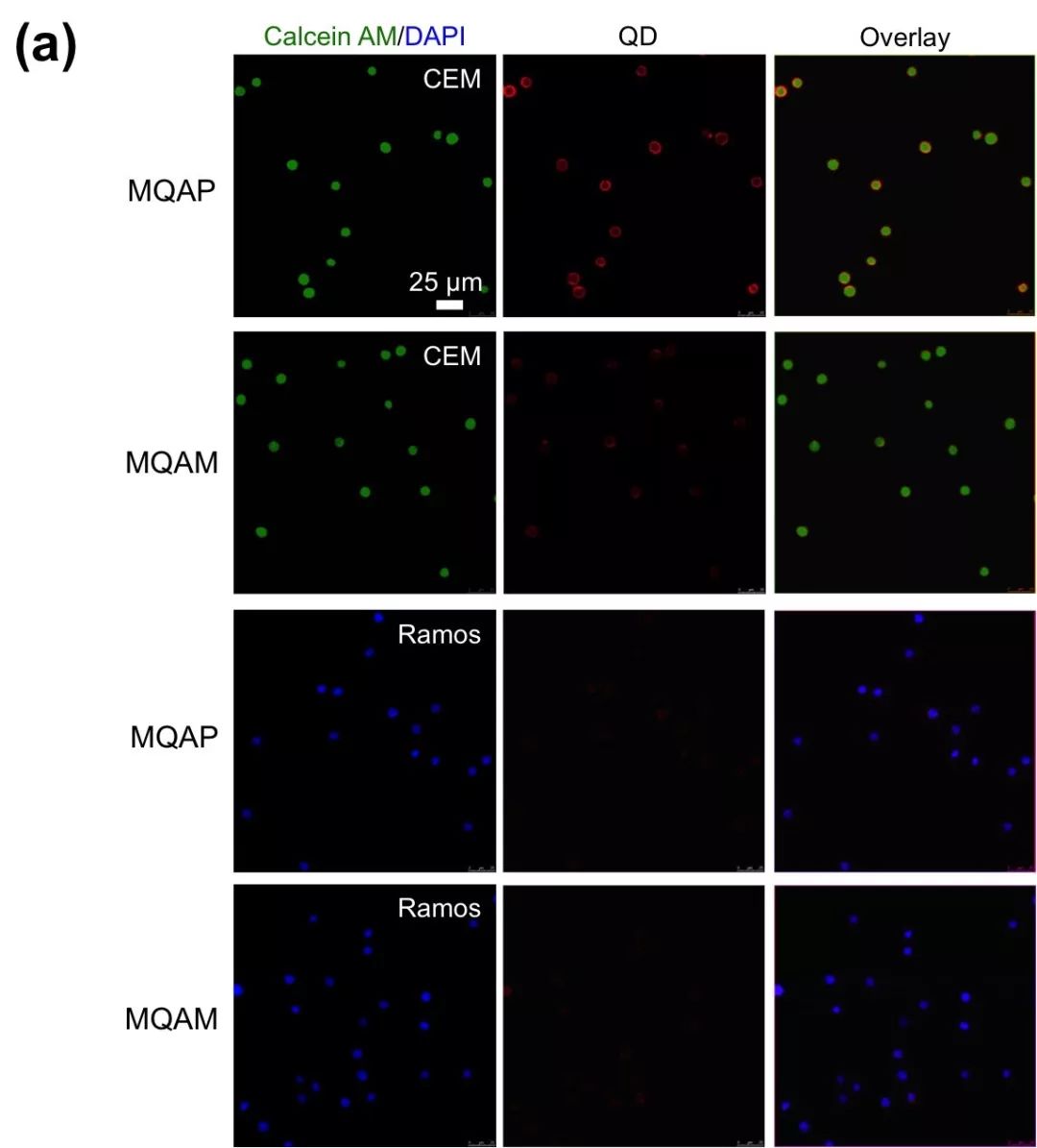 循环肿瘤细胞(CTC)在肿瘤转移中扮演着重要的角色,是导至癌症患者死亡的主要元凶之一。CTC检测对癌症早期诊断、预后判断以及治疗效果评估均具有重要意义。而CTC在外周血中含量极低,如何在数目众多的血细胞中对微量的CTC进行准确检测和计数是目前存在的一项技术难题。商业化的Cell Search系统是美国食品药品监督管理局(FDA)批准的唯一一套CTC检测系统,它利用免疫纳米磁珠对血液中CTC进行检测。这套系统虽能实现较高的捕获效率,但CTC捕获纯度却很低(<1%),大量的背景血细胞严重干扰了检测灵敏度和检测效率。 苏州大学马楠教授课题组发展了一类新型的量子点-磁颗粒-适配体共聚物,用于CTC的超灵敏捕获和检测。对CTC的捕获效率和捕获纯度达到了~80%,并可同步实现CTC单细胞成像。该聚合物是以DNA分子为模板将具有超顺磁性质的磁纳米颗粒、具有优异荧光性质的量子点纳米颗粒以及能够特异性识别肿瘤细胞的DNA适配体组装在一起(图一、图二)。通过DNA的聚合作用将磁颗粒的磁响应性和量子点的荧光光强同步放大;同时通过与细胞表面的多价键靶向作用大幅提高对肿瘤细胞的选择性。 图一、以DNA分子为模板构建量子点-磁颗粒-适配体共聚物以及该聚合物与肿瘤细胞表面受体的结合示意图 图二、 量子点-磁颗粒-适配体共聚物的透射电镜图 研究表明该聚合物可特异识别癌细胞,而与背景细胞的非特异性吸附可忽略不计。与量子点-磁颗粒-适配体组装单体相比该聚合物与癌细胞的结合力和选择性更强(图三),且提供了更高的荧光信号和磁响应性(图四)。 图三、量子点-磁颗粒-适配体共聚物(MQAP)和组装单体(MQAM)与目标癌细胞(CEM)和背景细胞(Ramos)相互作用的荧光图片 图四、量子点-磁颗粒-适配体共聚物(MQAP)和组装单体(MQAM)标记的癌细胞(CEM)在磁场作用下的运动情况。 进一步研究表明此类共聚物可以用于人血中微量CTC细胞的高效捕获和检测(图五)。在含有200个CTC/毫升的血液样品中其对CTC的捕获效率达到了78%,而捕获纯度达到了84%。通过量子点的高强度荧光信号对捕获的CTC细胞进行同步检测,同时保存了细胞的活性,可用于进一步分析。这与传统的三步检测法(细胞分离-细胞固定-细胞成像)相比又是一项改进。 图五、在磁场作用下对共聚物处理的血液样品中CTC细胞的捕获和成像。
