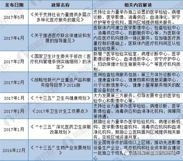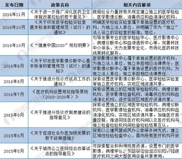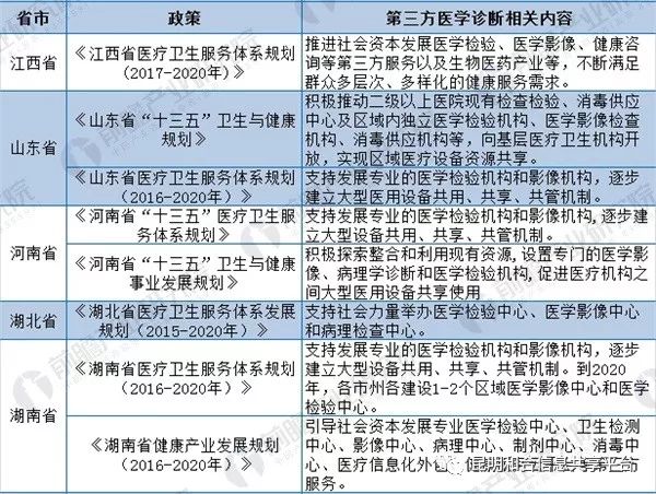 第三方医学诊断最大的特点是实现资源共享,达到与医院、患者、社会共赢的目标。通过第三方医学诊断,医疗机构可大幅降低成本、提升诊断质量、提高时效性、降低新项目引进风险等,与第三方医学诊断企业形成互利互补关系。 近年来,在医改不断深入以及专业化分工趋势下,我国第三方医学诊断呈现井喷式发展。截至2016年底,我国独立医学实验室数量已达468家,完成了跨越式突破增长。 图表1:2001-2017年中国独立医学实验室数量增长情况(单位:家) 资料来源:前瞻产业研究院整理 不过,受市场发展较晚和医疗制度等因素制约,我国第三方医学诊断行业仍处于发展初期,整体市场规模依旧有限。目前,我国政府已经意识到第三方医学诊断的优势,正不断加大对此的政策扶持。 2009年12月,《医学检验所基本标准(试行)》落地实施,标志着独立的医学检验所正式进入医疗机构;随后在2013年10月的《关于促进健康服务业发展的若干意见》中,明确大力发展第三方服务。此后,在多项政策中不断提及发展第三方医学诊断,逐步释放市场空间。 图表2:截至2018年全国第三方医学诊断行业政策汇总(一) 资料来源:前瞻产业研究院整理 图表3:截至2018年全国第三方医学诊断行业政策汇总(二) 资料来源:前瞻产业研究院整理 图表4:截至2018年全国第三方医学诊断行业政策汇总(三) 资料来源:前瞻产业研究院整理 可以预见,在医疗改革持续推动、公立医院成本上升、医学诊断技术不断进步、医疗服务外包意愿逐渐强化等作用下,我国第三方医学诊断行业将迎来历史机遇,发展前景广阔。 2018年各省市第三方医学诊断最新政策汇总及解读 在第三方医学诊断市场政策逐渐放开的大背景下,各省市均在不同方面、不同程度地支持第三方医学诊断行业的发展。我国大陆境内,除了西藏自治区,其他30个省市都在不同政策中提及鼓励发展独立的医学检验机构。 对于医疗服务发达的省市,如北京、上海、江苏、广东等,发展独立的医学检验机构需求更大,政策支持力度也较其他省份更大。例如,上海市分别在《上海市卫生计生改革和发展“十三五”规划》、《上海市医疗机构设置“十三五”规划》、《上海市区域卫生规划(2011年-2020年)》政策中,提及支持发展第三方检验机构。 尽管暂时没有一个省市出台专项政策规划,但未来随着需求加速释放,各省市还将加大对第三方医学诊断领域的支持。在各省市政策支持下,第三方医学诊断市场规模将会持续高速增长。 图表5:截至2018年各省市第三方医学诊断行业政策汇总(一) 资料来源:前瞻产业研究院整理 图表6:截至2018年各省市第三方医学诊断行业政策汇总(二) 资料来源:前瞻产业研究院整理 图表7:截至2018年各省市第三方医学诊断行业政策汇总(三) 资料来源:前瞻产业研究院整理 图表8:截至2018年各省市第三方医学诊断行业政策汇总(四) 资料来源:前瞻产业研究院整理 |