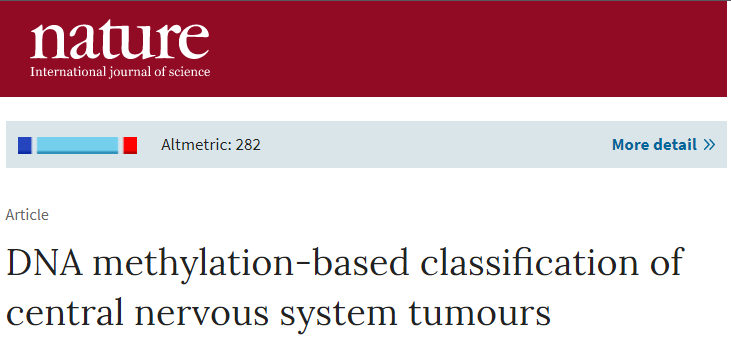 本文转载自“澎湃新闻”,原标题:德国学者用机器学习“癌症指纹”诊断脑瘤,人为误诊率12%。 3月15日凌晨,德国癌症研究中心(DKFZ)的Stefan Pfister及其同事的一项最新成果在线发表在顶级学术期刊《自然》(Nature),该团队研发了一款特别针对脑肿瘤的诊断AI工具。 对脑肿瘤治疗来说,正确诊断是提供治疗前的一项基础工作。目前已知的肿瘤有近100中类型,然而神经中枢系统的肿瘤是其中最难做到准确区分和诊断的。为解决这一难题,Pfister及其同事利用DNA甲基化数据训练了一种机器学习方法,最终可以根据甲基化数据对脑肿瘤进行自动分类。 所谓的DNA甲基化,即在甲基化转移酶的帮助下,活性甲基转移至DNA链中特定碱基上的化学修饰过程,也被形象地称为给DNA“戴帽子”。 这顶“帽子”在调控基因表达、维持染色质结构、基因印记、X染色体失活以及胚胎发育等生物学过程中都会发挥重大作用。近年来也有研究表明,DNA异常甲基化和肿瘤的发生、发展、细胞癌变有着密切的联系,甲基化因此也被称为癌症的“通用指纹”。