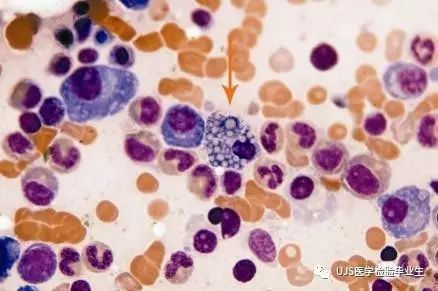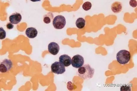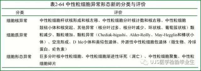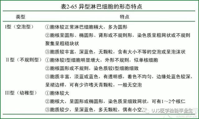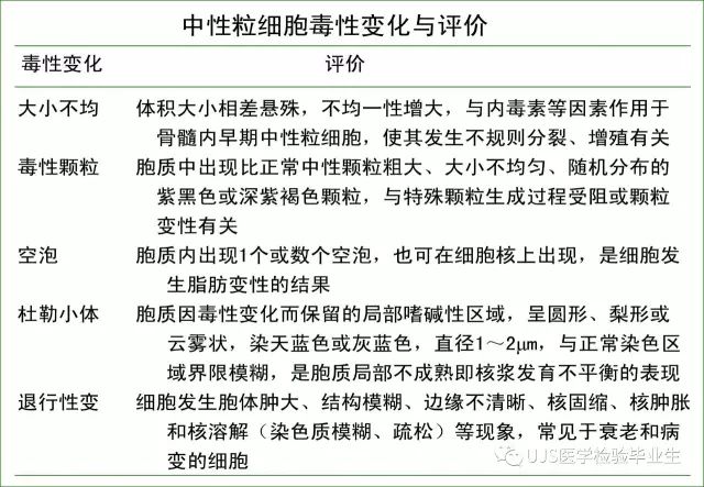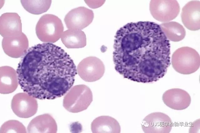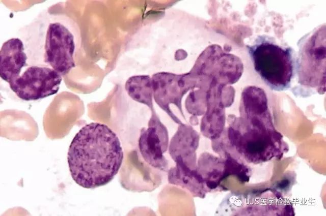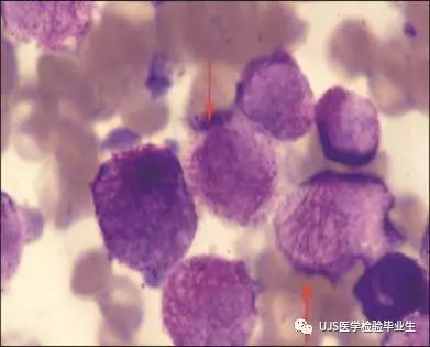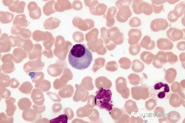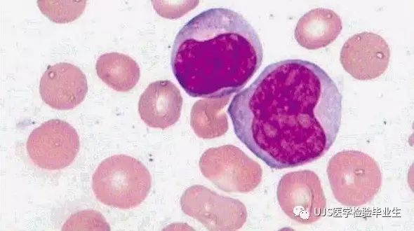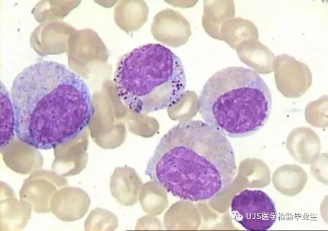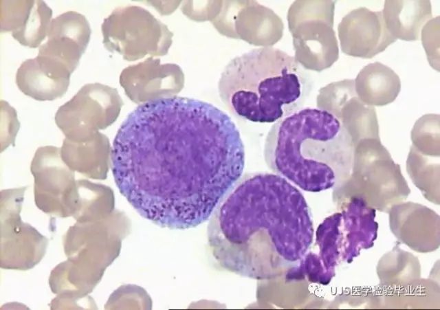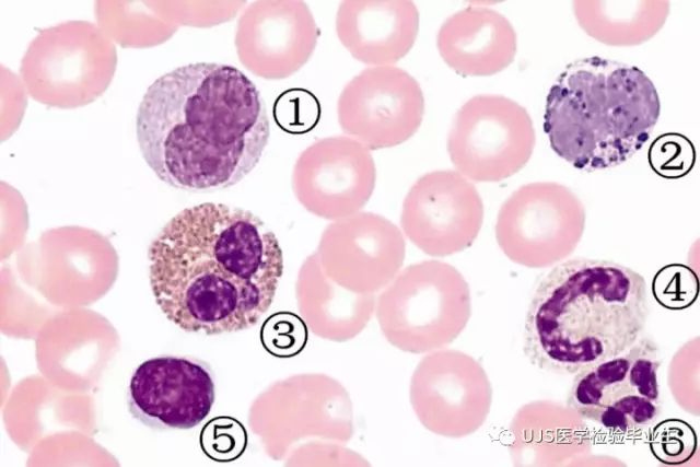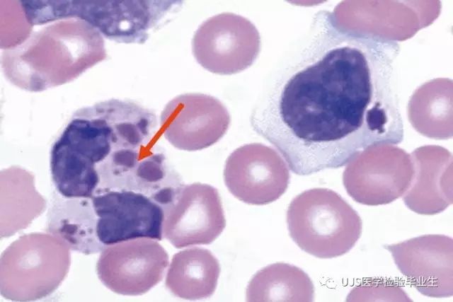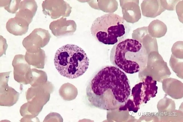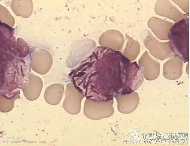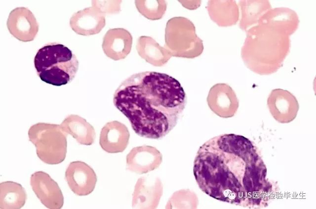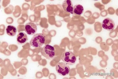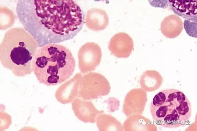 说明: 一、没有制备/染色良好的血涂片,准确的形态学检验结果根本无从谈起; 关于血涂片的制备/染色,请参考以下两文: 二、本文采用的并非ICSH新的命名特征与分级标准; 想看新版本,可点击“阅读原文”,或者戳以下链接: 白细胞形态学检查主要采用显微镜法;现代自动图像分析仪和血液分析仪还未能取代显微镜;血液分析仪对异常结果作出报警后,仍需要采用显微镜法检查血涂片进行复查,以提供更加确切的细胞形态学检查结果。 一、正常形态白细胞 1.外周血液正常形态白细胞特征 正常形态白细胞特征如下表: 下图中的白细胞分别为 ①:单核细胞 ②:嗜碱性粒细胞 ③:嗜酸性(分叶核)粒细胞 ④:(嗜)中性杆状核粒细胞 ⑤:(小)淋巴细胞 ⑥:(嗜)中性分叶粒细胞、 【笔者注】查看更多外周血正常白细胞的图片,可访问下列两文: 2.中性粒细胞核形界定 凡胞核完全分离或核间以一丝(只有核膜而无染色质)相连者为分叶核粒细胞(如下图); 细胞核径最窄处小于最宽处1/3者为分叶核粒细胞,大于1/3者为杆状核粒细胞;若两丝相连者则为杆状核粒细胞(如下图)。 当中性粒细胞杆状核与分叶核难以鉴别时,可将其归类于分叶核。 3.粒细胞胞质内颗粒 中性粒细胞胞质内的颗粒分为嗜天青颗粒(占20%)和特殊颗粒(占80%),其比较见表2-60。 二、中性粒细胞异常形态 1.毒性变化 在严重的化脓性感染、败血症、恶性肿瘤、急性中毒、大面积烧伤等病理情况下,中性粒细胞可发生多种形态改变。 下图中可见中性粒细胞大小不均: 下图中可见中毒颗粒: 下图中可见空泡形成: 下图中可见杜勒小体: 下图为退行性变等 这些形态变化对观察病情变化和判断预后有一定意义。 2.中性粒细胞的核象变化 核象标志着中性粒细胞从新生细胞至衰老细胞的发育阶段。正常情况下,外周血液中性粒细胞以分叶核为主,胞核常分为2~5叶,杆状核较少。病理情况下,中性粒细胞的核象可发生核左移或核右移。 (1)核左移 外周血液的中性杆状核粒细胞增多或(和)出现晚幼粒细胞、中幼粒细胞,甚至原始/早幼粒细胞的现象,称为核左移。 下图中,杆状核粒细胞增多(正常情况下,中性杆状核粒细胞与中性分叶核粒细胞之比约为1:13): 下图中出现了中性中幼/晚幼粒细胞: 下图中出现了早幼粒细胞(最左): 核左移常见于一些良性疾病,如化脓性感染、急性溶血以及应用细胞因子等,常伴有中毒颗粒、空泡形成、退行性变等毒性变化。核左移多伴有白细胞总数增高,但也可正常甚至减少。 ①再生性核左移:核左移伴白细胞总数增高称为再生性核左移,提示骨髓造血功能和释放能力旺盛,机体抵抗力强等。 ②退行性核左移:核左移伴白细胞总数正常或减少称为退行性核左移,提示骨髓释放功能受到抑制,机体抵抗力差。 核左移分为轻、中、重度三级,与感染的严重程度和机体的抵抗力密切相关(表2-61)。 然而核左移也可见于一些恶性疾病,如急性/慢性粒细胞白血病。 下图为慢性粒细胞白血病,可见一个早幼粒细胞和三个中幼粒细胞: (2)核右移 外周血液的中性分叶核粒细胞增多,并且5叶核以上的中性粒细胞>3%时称为核右移(如下图,正中细胞胞核分为六叶)。 严重核右移常伴有白细胞总数减少,提示骨髓造血功能衰退,与缺乏造血物质、DNA合成障碍和骨髓造血功能减退有关。 核右移常见于巨幼细胞性贫血、内因子缺乏所致的恶性贫血(其实是巨幼细胞性贫血的一种特殊情况)、感染、尿毒症、MDS等,应用抗代谢药物治疗肿瘤时也会出现核右移(会影响叶酸的利用,类似于巨幼细胞性贫血)。 3.中性粒细胞胞核异常形态 下图中可见巨多分叶核中性粒细胞: 下图中可见巨杆状核中性粒细胞(其下方还有一个巨晚幼粒细胞): 下图中可见多分叶核中性粒细胞: 下图中可见双核粒细胞: 下图中可见环形杆状核粒细胞: 4.与遗传因素相关的中性粒细胞畸形 下图为Chediak-Higashi畸形: 下图为Alder-Reilly畸形: 下图为May-Hegglin畸形: 下图为Pelger-Hüet畸形: 5.棒状小体 白细胞胞质中出现的紫红色细杆状物质,1个或数个,长约1~6μm,称为棒状小体(如下图): 出现数个棒状小体,呈束状排列(柴束状)的白细胞称为柴捆细胞(faggot细胞),如下图: 下图中也是柴捆细胞,来自@王霄霞_血液学检验教师 新浪微博: 棒状小体的出现情况:急性粒细胞白血病(多见)、急性单核细胞白血病(少见)、急性淋巴细胞白血病则无。 6.中性粒细胞异常形态新的分类(表2-64) 三、淋巴细胞异常形态 1.异型淋巴细胞 在病毒(如腺病毒、人类疱疹病毒等)、原虫(如弓形虫)感染,药物反应、结缔组织疾病、应激状态或过敏原等因素刺激下,淋巴细胞增生并发生形态上的变化,表现为胞体增大、胞质增多、嗜碱性增强、细胞核母细胞化,称为异型淋巴细胞或反应性淋巴细胞。异型淋巴细胞的形态特点见表2-65。 下图为Ⅰ型异型淋巴细胞(左上角),又称泡沫型或浆细胞型: 下图为Ⅱ型异型淋巴细胞,又称单核细胞型: 下图为Ⅲ型异型淋巴细胞(右侧),又称未成熟细胞型或幼淋巴细胞型: 下图中从左到右,依次为异型淋巴细胞Ⅰ型,Ⅲ型,Ⅱ型 2.卫星核淋巴细胞 淋巴细胞主核旁有1个游离的卫星小核称为卫星核淋巴细胞。因染色体损伤,丧失着丝点的染色单体或其片段在有丝分裂末期,未进入子代细胞遗传物质体系内而形成。 常见于接受较大剂量电离辐射、核辐射之后,或其他理化因素、抗癌药物等造成的