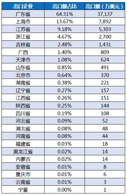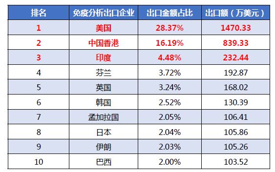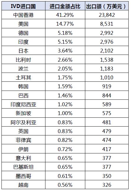 分析定义 数据来源:海关统计WISMAR医疗器械海外代理商查询系统 数据维度: IVD设备整机出口常用海关编码 90278099 90275000 名词定义: POCT( 根据产品名及仪器临床诊断时间及环境 ) 分析范畴 不含内容:本报告涉及数据包试 剂(盒)、试纸及覆于衬背配件 统计时间:为截至海关结日期2017年12月31日 误差原因:企业内部销售数据统计时间节点误差;合同结款时委托物流及同行业间代理销售误差;细分产品企业总销售额误差;国家统计微调整机、零配件、试剂销售误差。 分析方法 排名方法:贸易式为一般,FOB 美元总金额占比排名 TOP10 (不含来料加工及保税其他贸易方式) 产品归类:按申报名称行业惯例区分法类 进口国:申报目的国(不含转运国) 01 IVD整机总出口规模简析 根据大连维斯马医疗器械研究中心统计 2017年(不含试剂 )共向173个国家和地区出口,2017 年出口总额高达 5.77亿美金。 IVD整机中国2017累计1-12月 出口国TOP20格局图 02 IVD整机进口国市场规模 2017年1-12月IVD仪器出口额占比前五。中国香港 41.29%、美国 14.77%、德国 5.18%、印度5.15%、日本3.64%。其中香港为转口贸易,主要有香港离岸公司进口拉高占比。 图示金额:万美元 03 POCT与IVD整机出口概况 2017年大连维斯马医疗器械研究中心根据设备检验环境划分。 POCT( 床边检验 )出口总额 26572 万美金,POCT 占总IVD设备出口 46.02%。 POCT占总IVD整机出口比例 04 POCT与检验中心设备出口概况 2017 年1-12 月大连维斯马医疗器械研究中心根据细分领域统计血糖类检验仪器出口额: 25352.83万美元居首,血球出口额:10445.45万美元位居第二,生化检验设备以8255.34万。 TOP20 IVD设备企业2017年1-12月出口 TOP 20 POCT企业2017年1-12月出口 05 检验中心设备分类企业出口 2017年1-12月市场份额 2017年1-12月血球类检验产品共计出口约7019.95万美金。 2017年1-12月生化类检验产品共计出口约5789.92万美金。 2017年1-12月尿液类检验产品共计出口约1082.79万美金。 2017年1-12月免疫类检验产品共计出口约为2650.83万美金。 06 检验中心设备分类 2017年1-12月出口国概况 07 中国IVD行业2017年产业格局图 IVD产业中国去也分布格局图 2017年1-12月全国经营IVD设备出口企业共计668家。广东、上海、江苏为IVD出口前三大省。其中广东省占据出口企业总规模22.31%。 08 IVD产业各省出口贡献比例图 原创文章,仅代表作者本人观点,不代表麦科田医疗的立场,转载请注明来源及作者。 数据来源:www.wsminfo.com 制表单位:大连维斯马 |