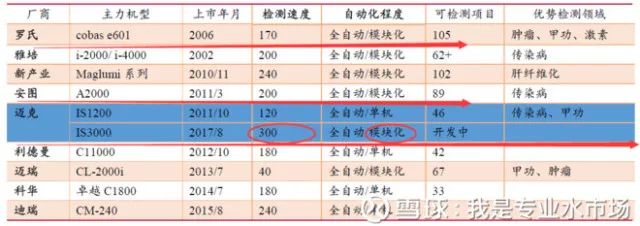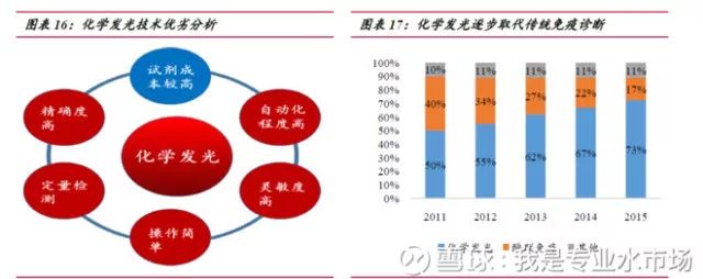人生就像滚雪球,最重要的是发现很湿的雪和很长的坡。 ——沃伦·巴菲特 啥是IVD? 也就是指体外诊断 , 是指通过对采集的人体体液 、 组织或细胞等样本进行体外检测从而获得诊断信息 , 进而判断疾病或机体的代谢功能状况 。 据卫计委统计 , 我国出院病人人均检查费用约占医疗费用总额的26.7% , 而体外诊断作为医疗检查中的重要部分 , 预计占据医疗费用10%以上份额 , 市场空间较大 。 体外诊断按其检测原理或检测方法可分为生化诊断 、 免疫诊断 、 分子诊断 、 微生物诊断 、 血液诊断等诊断方法 。 其中 , 生化诊断是发展最为成熟的诊断方法之一 , 而免疫诊断是目前国内体外诊断发展速度最快 、 占比最大的主流诊断方法 , 两者合计占整个体外诊断市场近60%的份额 。 IVD行业空间如何? 根据Kalorama Information 和Boston Medical 的数据 , 2016 年我国人均体外诊断支出为4.6 美元 , 仅为世界平均水平的一半 (2016 年全球人均体外诊断支出约为85美元) , 而欧美等发达国家这一数字达到25 美元 。 参照海外成熟诊断市场的发展情况 , 我国体外诊断的潜在市场规模为2000 亿元 。 而依据 《中国健康产业蓝皮书(2016)》 的数据 , 2016 年我国体外诊断市场规模约为430 亿元 , 未来仍有较大发展空间 。 考虑我国经济水平的快速发展 , 人口老龄化 、 城镇化的加剧以及居民健康保健意识的增强致使下游诊断需求的不断增长 , 加上国内产业政策方面的支持 , 预计未来三年诊断行业将保持近20%的年增长率 , 到2019 年行业整体规模有望达到723 亿元 。 迈克生物的核心亮点: 1.技术升级版的300 速发光仪IS3000 , 预计18 年二季度有望开始投放 免疫诊断是当下占比最大的IVD 子版块 , 化学发光技术正逐步完成对酶免等传统免疫技术的替代 ,已成为当下免疫诊断的主流技术 。 从市场空间上看 , 预计在我国 , 化学发光仪的市场保有量约为 3 万台左右 , 其中 , 三级医院市场大多被外资企业占据外 , 本土厂商则依靠高性价比优势向部分三级医院及人流量较多的二级医院渗透 , 而其他二级及以下医院和医疗机构大多处于空白 。 按照不同等级医院化学发光仪的需求来推算 , 预计医院端化学发光仪的容量近 5万台 , 市场空间 270 亿左右 。 考虑到分级诊疗带来的区域检测中心及基层医疗机构检测样本的增加 , 预计国内化学发光整体市场超过 300 亿元 , 而用各公司收入加总法估算 2016 年国内化学发光市场规模约为 170 亿元 。 目前仍有一倍市场空间 。 从市场竞争格局上看 , 我国化学发光市场仍以进口品牌为主 , 仅罗氏 、 雅培 、 贝克曼 、 西门子四家就占据了 80%以上份额 , 国内厂商合计占比只有 10%出头 , 与生化诊断 70%的国产占有率相比有较大差距 。 参照国内生化诊断的发展历程 , 化学发光仍有数倍的进口替代空间。 重点来了! ! ! 公司于17 年8 月推出了技术升级版的300 速发光仪IS3000 ,该仪器主要面向三级及大型二级医院 , 目前已经完成注册 , 预计18 年二季度有望开始投放 , 随着配套检测试剂的不断研发推出 , 将成为化学发光产品新增长点 。 另外 , IS3000 全自动化学发光仪可进行模块化连接 , 将来有望与日立的全自动生化分析仪连接形成生化免疫流水线 , 持续提升公司核心竞争力 。 预计2017 年化学发光的试剂销售额将达到2.9 亿元 , 同比增长63% , 18 、 19 年有望维持高速增长的态势增长 。 (看看这幅图 , 迈克生物的新发光仪的检测速度可是目前所有产品当中最快的 , 并且对老的120速的实现了模块化的升级) 这一切与公司的研发投入密不可分 。 公司较为重视对产品创新研发的投入 , 研发资金随着自主产品的规模增加而快速增长 , 2014-2016 年研发投入分别为4377 万元 、 5726 万元 、 和8594 万元 , 占自主产品整体收入比例分别为8.36% 、 10.94% 、 14.67% , 研发水平逐年提升 , 研发投入比例处于行业领先水平 。 公司拥有国际一流的诊断产品研发团队 , 2016 年研发人员数量达到 352 人 , 同比增长接近100% 。 衡量一家医院生物公司的后劲 , 研发投入是硬指标! 2 、 体外诊断全产业链的布局 布局血球诊断: 公司于 2015 年 8 月通过股权收购参股加斯戴克 , 2016 年通过多次股权并购达到控股 , 17 年 10 月再次通过股权收购 , 使得加斯戴克成为公司全资子公司 。 加斯戴克自主研发的荧光染色五分类血球仪已赶上国际先进水平 , 目前国内仅有希森美康 、 迈瑞和加斯戴克的产品上市 。 加斯戴克拥有两款全自动血液分析仪 DH-510和 DH-520 , 其中五分类血液分析仪 DH-520 除了能对正常细胞进行分类外 , 还能对异常细胞进行识别和报警 , 对于某些血液疾病 , 如白血病的早期发现有着极为重要的临床价值 布局基因测序: 迈克生物于 2017 年与德国凯杰 QIAGEN N.V.合资设立迈凯基因 , 拥有新公司 60%的股权 。 新公司将开展新一代测序技术及产品的本地化开发 、 生产 、 组装 、 和销售 , 为客户提供从样本制备到结果解读的完整二代测序解决方案 , 并持续开发和商业化未来 NGS 产品 。 迈凯基因将是凯杰在中国 NGS 产品本地化和商业化的唯一合作伙伴 。 分子诊断是目前发展最为迅速的体外诊断细分行业之一 , 而基因测序是未来之星 , 目前 , 分子诊断约占我国体外诊断市场规模的 15% , 2010 年市场规模约为 48 亿元 , 并保持 20%左右的年增长率 , 预计到 2019 年我国分子诊断市场规模将突