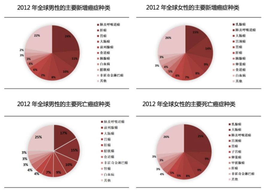 表五:2012年全球男/女性主要新增癌症种类及主要死亡种类