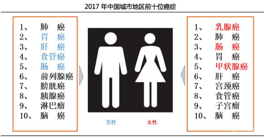 当前,城市地区男性最普遍的5种癌症依次为:肺和支气管癌症、胃癌、肝癌、食管癌、结直肠癌,这些占到所有癌症病例的三分之二;女性中最普遍的5种癌症依次为:乳腺癌、肺和支气管癌、结直肠癌、胃癌及甲状腺癌,甲状腺癌快速上升,乳腺癌占所有女性癌症的15%。