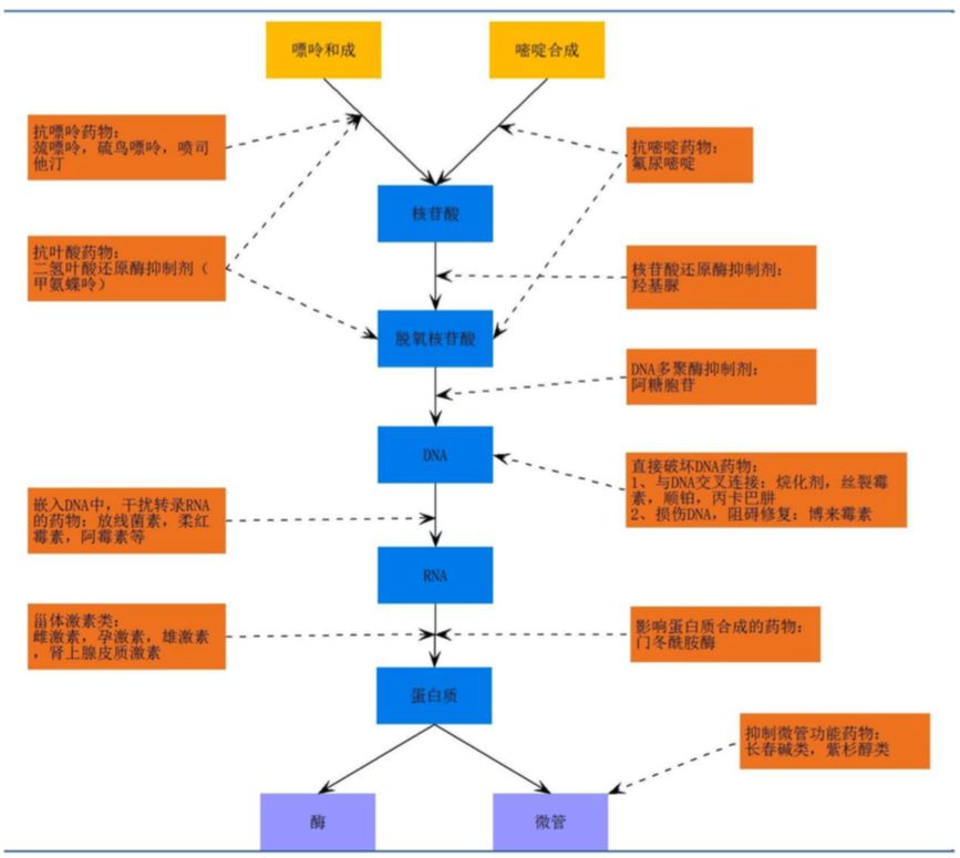 传统化疗药物是以细胞分裂周期为核心, DNA、RNA和蛋白质的合成为主要线索发挥治疗作用的。作用的时点是细胞分裂的周期,简而言之传统化疗就是针对一切细胞分裂起作用,并不区分正常细胞和肿瘤细胞。只是肿瘤细胞分裂速度快作用大、而正常人体细胞分裂速度慢而影响相对小。