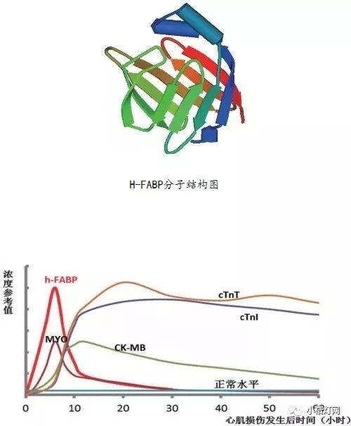 H-FABP的分子量很小,可以快速释放入血,最快在心肌损伤30min时血液中可检出,H-FABP在非心肌组织当中表达极低或不表达,由于心肌细胞对缺血缺氧的高度敏感,动员脂肪酸供能,导至了心肌细胞中的H-FABP迅速升高 。