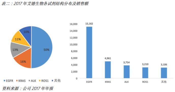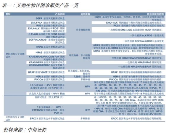 艾德生物是A股唯一专注于肿瘤精准医疗伴随检测技术的标的,基于完全自主知识产权的技术平台开发出的基因检测试剂盒覆盖主要癌症靶点、核心产品在细分领域市场占有率处于第一梯队、在研产品陆续推出且采取绑定靶向药制造商共同开发战略、国内直销体系搭建基本完成、发力开拓海外市场,公司在该领域具备多维度显著且持续的竞争优势。 检测试剂盒靶点布局全面、先发优势突出 从产品角度来看,公司已上市伴随诊断检测试剂盒靶点布局全面、先发优势突出。产品主要覆盖非小细胞肺癌、结直肠癌、乳腺癌、胃癌等高发病率及靶向药上市品种较多的领域。布局宫颈癌筛查领域(HPV,人乳头瘤状病毒,宫颈癌致病病毒)。 针对目前肿瘤精准医疗最重要的 EGFR、KRAS、BRAF、EML4-ALK、 PIK3CA、ROS1、NRAS、Her-2 等基因位点,公司陆续研发的独立或联合检测试,均为我国首批取得国家药监局医疗器械注册证书和通过欧盟 CE 认证的产品。其中,EGFR、KRAS、ALK、ROS1四种基因突变试剂盒及相关联合试剂盒占据试剂销售收入比例的90%,EGFR相关检测试剂盒比例高达50%,2017年销售额高达1.5亿元人民币。 核心产品在中国及欧盟连续多年市场占有率第一 艾德生物的核心产品,用于检测非小细胞肺癌基因突变状态的EGFR 基因突变检测试剂盒占EGFR检测市场份额超过70%。2016年,欧洲分子基因诊断质量联盟(EMQN)发起了国际室间质量评价活动。在所有参与EGFR/KRAS/BRAF基因检测实验室评比的来自48个国家的325家医院中,281家采用商业试剂盒,其中,艾德生物(AmoyDx,126/281,44.84%)已是连续三年蝉联商业试剂盒使用率第一,力压罗氏(Roche,48/281,17.08%)和凯杰(Qiagen,29/281,10.32%)。 表三:目前国内伴随诊断企业上市的代表性品种一览 此外,ROS1检测产品于2017年1月已获得日本厚生劳动省批准并进入日本医保支付,成为全球首个获批的克唑替尼伴随诊断试剂。 在研产品陆续推出、进军液态活检领域、布局基因测序 公司研发储备丰富,HPV产品已近期获批,2018年1月19日, CFDA 通过创新医疗器械特别审批通道,批准艾德生物的 Super-ARMS®EGFR 基因突变检测试剂盒,用于临床检测晚期非小细胞肺癌(NSCLC)患者血液 ctDNA 中 EGFR 基因突变状态,筛选适合接受奥西替尼等三代 EGFR 靶向药物治疗的患者。这是我国首个以伴随诊断试剂标准获批上市的 ctDNA 检测试剂盒。 液体活检能够在癌症早筛、临床疗效评估、用药指导(药敏及耐药检测)、 术后复发及转移检测、新药研发及癌症转移研究等环节广泛应用,有助于延长肿瘤患者的生存期、 提高生存质量。市场规模角度,据BCC 预测,全球液体活检市场2020年将达220亿美元,我国市场规模约200亿元人民币 布局二代测序基因检测试剂盒:公司基于NGS平台的多基因联检产品已纳入绿色审评通道——产品可检测10个基因位点的人类癌症多基因突变联合检测试剂盒(可逆末端终止测序法),这款产品基于艾德生物与Illumina合作的NGS技术平台构建, 也可针对血液样本进行多基因检测。 总体而言,对于HPV(宫颈癌筛查)领域,公司竞争对手主要为凯普生物,相比而言不具备先发优势与技术优势,也非公司战略重点。 对于液态活检产品,从公司公告披露的预期用途来看“本试剂盒用于体外定性检测晚期非小细胞肺癌(NSCLC)患者血浆DNA样本中人类EGFR突变基因。其中19外显子缺失、L858R突变用于盐酸埃克替尼片的伴随诊断检测, T790M突变用于甲磺酸奥希替尼片的伴随诊断检测。血浆EGFR检测敏感度尚不能达到组织样本检测水平,因此推荐用于晚期NSCLC患者,且作为不易获取NSCLC组织样本时的补充手段。如可以获得病理组织时,建议优先考虑病理组织检测结果”,产品依旧定位EGFR靶点非小细胞肺癌领域,但仅用于晚期不易获取病理检测结果患者的补充场景,贡献增量有限,更多意义上在于巩固核心产品的市场地位。 而布局二代测序仪,战略意义大于现实考量,一是占据先发优势、二是防范技术替代。 公司具有自主知识产权的核酸分子检测技术( ADx-ARMS®)是目前国际上肿瘤精准医疗分子诊断领域领先的技术之一。公司招股说明书对于ADx-ARMS®技术的描述如下“公司自主研发的发明专利授权技术,该技术利用特异引物对突变靶序列进行高精准 PCR 扩增放大,并利用一种新型探针在实时荧光定量 PCR平台上实现对样品 DNA中突变的检测,具有极高的特异性和灵敏度,可准确检测出含量低至 1%的突变 DNA,适合石蜡包埋样本、新鲜组织和胸水、血清、血浆等样本的基因检测。” 尽管PCR技术本身已十分成熟,但对于在该技术平台上实现极高的特异性和灵敏度以及规模化量产依旧具备较高的技术壁垒。 此外,在技术平台的布局上,公司涵盖了PCR、 FISH、 IHC、一代测序、二代测序等各技术平台。 目前对于二代测序与PCR两种技术路线在肿瘤伴随诊断领域的主流看法是未来 NGS 技术与PCR 技术将并存发展,单基因或位点较少的多基因检测完全可以通过 PCR 技术平台得到满足,且检测周期更短;而 10 个以上基因的检测则在 NGS 技术下实现更具性价比。 绑定靶向药制造商、加大海外市场布局力度 公司与多家创新药巨头战略合作,紧密跟踪在研新药。公司在国际化合作方面是多家跨国制药公司肿瘤精准医疗(包括阿斯利康、 辉瑞、默克和勃林格殷格翰等)的合作伙伴。海外市场对于靶向药与对应检测试剂盒要求从研发端即绑定,存在高竞