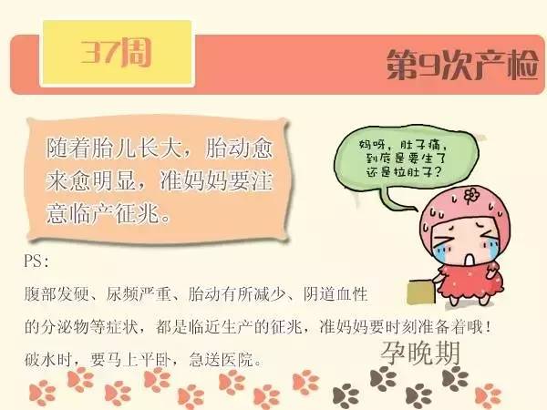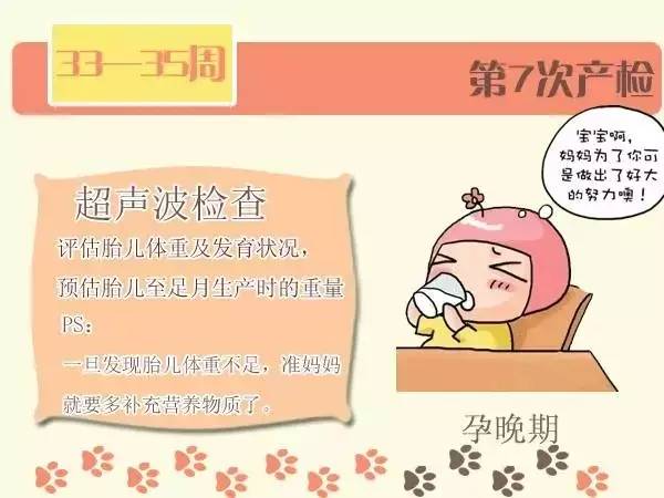 到了孕期34周时,建议准妈妈做一次详细的超声波检查,以评估胎儿当时的体重及发育状况,并预估胎儿至足月生产时的重量。一旦发现胎儿体重不足,准妈妈就应多补充一些营养物质 。 Tip:准妈妈在37周前,要特别预防早产的发生,如果阵痛超过30分钟以上且持续增加,又合并有阴道出血或出水现象时,一定要立即送医院检查。